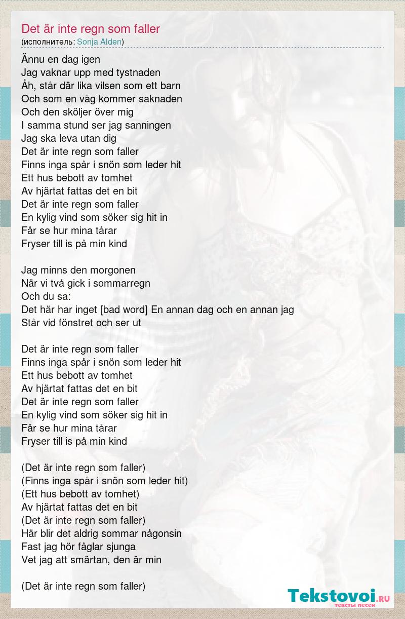Ännu en dag igen Jag vaknar upp med tystnaden Åh, står där lika vilsen som ett barn Och som en våg kommer saknaden Och den sköljer över mig I samma stund ser jag sanningen Jag ska leva utan dig Det är inte regn som faller Finns inga spår i snön som leder hit Ett hus bebott av tomhet Av hjärtat fattas det en bit Det är inte regn som faller En kylig vind som söker sig hit in Får se hur mina tårar Fryser till is på min kind Jag minns den morgonen När vi två gick i sommarregn Och du sa: Det här har inget [bad word] En annan dag och en annan jag Står vid fönstret och ser ut Det är inte regn som faller Finns inga spår i snön som leder hit Ett hus bebott av tomhet Av hjärtat fattas det en bit Det är inte regn som faller En kylig vind som söker sig hit in Får se hur mina tårar Fryser till is på min kind (Det är inte regn som faller) (Finns inga spår i snön som leder hit) (Ett hus bebott av tomhet) Av hjärtat fattas det en bit (Det är inte regn som faller) Här blir det aldrig sommar någonsin Fast jag hör fåglar sjunga Vet jag att smärtan, den är min (Det är inte regn som faller)