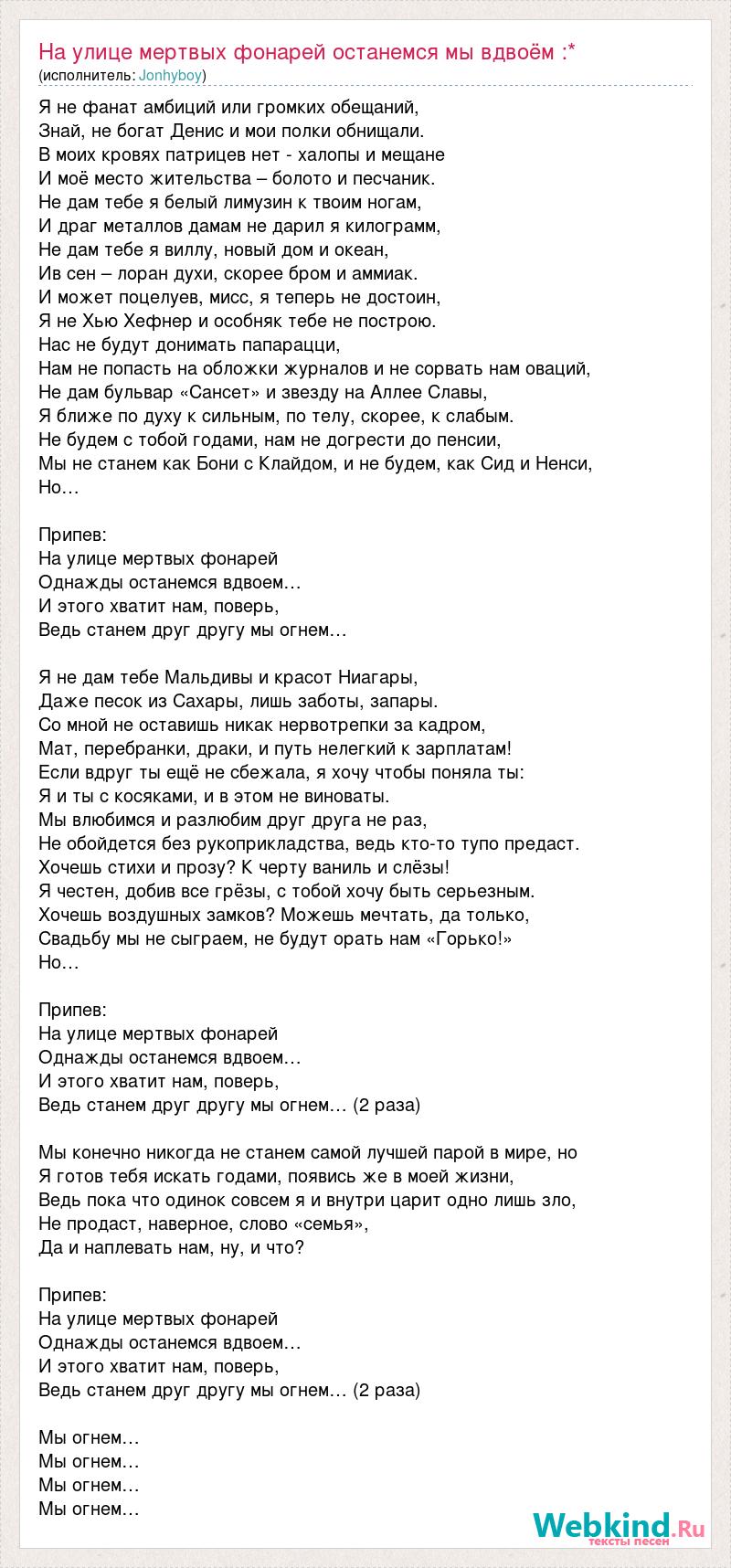 Я не фанат амбиций или громких обещаний, Знай, не богат Денис и мои полки обнищали. В моих кровях патрицев нет - халопы и мещане И моё место жительства – болото и песчаник. Не дам тебе я белый лимузин к твоим ногам, И драг металлов дамам не дарил я килограмм, Не дам тебе я виллу, новый дом и океан, Ив сен – лоран духи, скорее бром и аммиак. И может поцелуев, мисс, я теперь не достоин, Я не Хью Хефнер и особняк тебе не построю. Нас не будут донимать папарацци, Нам не попасть на обложки журналов и не сорвать нам оваций, Не дам бульвар «Сансет» и звезду на Аллее Славы, Я ближе по духу к сильным, по телу, скорее, к слабым. Не будем с тобой годами, нам не догрести до пенсии, Мы не станем как Бони с Клайдом, и не будем, как Сид и Ненси, Но… Припев: На улице мертвых фонарей Однажды останемся вдвоем… И этого хватит нам, поверь, Ведь станем друг другу мы огнем… Я не дам тебе Мальдивы и красот Ниагары, Даже песок из Сахары, лишь заботы, запары. Со мной не оставишь никак нервотрепки за кадром, Мат, перебранки, драки, и путь нелегкий к зарплатам! Если вдруг ты ещё не сбежала, я хочу чтобы поняла ты: Я и ты с косяками, и в этом не виноваты. Мы влюбимся и разлюбим друг друга не раз, Не обойдется без рукоприкладства, ведь кто-то тупо предаст. Хочешь стихи и прозу? К черту ваниль и слёзы! Я честен, добив все грёзы, с тобой хочу быть серьезным. Хочешь воздушных замков? Можешь мечтать, да только, Свадьбу мы не сыграем, не будут орать нам «Горько!» Но… Припев: На улице мертвых фонарей Однажды останемся вдвоем… И этого хватит нам, поверь, Ведь станем друг другу мы огнем… (2 раза) Мы конечно никогда не станем самой лучшей парой в мире, но Я готов тебя искать годами, появись же в моей жизни, Ведь пока что одинок совсем я и внутри царит одно лишь зло, Не продаст, наверное, слово «семья», Да и наплевать нам, ну, и что? Припев: На улице мертвых фонарей Однажды останемся вдвоем… И этого хватит нам, поверь, Ведь станем друг другу мы огнем… (2 раза) Мы огнем… Мы огнем… Мы огнем… Мы огнем…