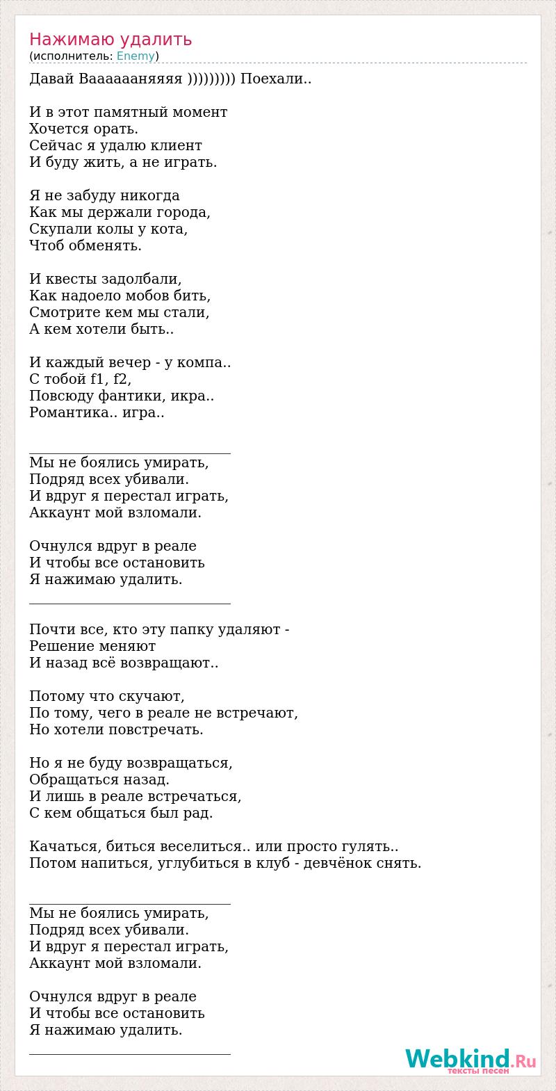 Давай Вааааааняяяя ))))))))) Поехали.. И в этот памятный момент Хочется орать. Сейчас я удалю клиент И буду жить, а не играть. Я не забуду никогда Как мы держали города, Скупали колы у кота, Чтоб обменять. И квесты задолбали, Как надоело мобов бить, Смотрите кем мы стали, А кем хотели быть.. И каждый вечер - у компа.. С тобой f1, f2, Повсюду фантики, икра.. Романтика.. игра.. _____________________________ Мы не боялись умирать, Подряд всех убивали. И вдруг я перестал играть, Аккаунт мой взломали. Очнулся вдруг в реале И чтобы все остановить Я нажимаю удалить. _____________________________ Почти все, кто эту папку удаляют - Решение меняют И назад всё возвращают.. Потому что скучают, По тому, чего в реале не встречают, Но хотели повстречать. Но я не буду возвращаться, Обращаться назад. И лишь в реале встречаться, С кем общаться был рад. Качаться, биться веселиться.. или просто гулять.. Потом напиться, углубиться в клуб - девчёнок снять. _____________________________ Мы не боялись умирать, Подряд всех убивали. И вдруг я перестал играть, Аккаунт мой взломали. Очнулся вдруг в реале И чтобы все остановить Я нажимаю удалить. _____________________________
