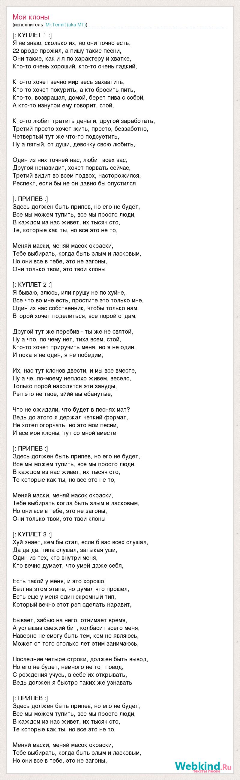 [: КУПЛЕТ 1 :] Я не знаю, сколько их, но они точно есть, 22 вроде прожил, а пишу такие песни, Они такие, как и я по характеру и хватке, Кто-то очень хороший, кто-то очень гадкий, Кто-то хочет вечно мир весь захватить, Кто-то хочет покурить, а кто бросить пить, Кто-то, возвращая, домой, берет пива с собой, А кто-то изнутри ему говорит, стой, Кто-то любит тратить деньги, другой заработать, Третий просто хочет жить, просто, беззаботно, Четвертый тут же что-то подсуетить, Ну а пятый, от души, девочку свою любить, Один из них точней нас, любит всех вас, Другой ненавидит, хочет порвать сейчас, Третий видит во всем подвох, насторожился, Респект, если бы не он давно бы опустился [: ПРИПЕВ :] Здесь должен быть припев, но его не будет, Все мы можем тупить, все мы просто люди, В каждом из нас живет, их тысяч сто, Те, которые как ты, но все это не то, Меняй маски, меняй масок окраски, Тебе выбирать, когда быть злым и ласковым, Но они все в тебе, это не загоны, Они только твои, это твои клоны [: КУПЛЕТ 2 :] Я бываю, злюсь, или грущу не по хуйне, Все что во мне есть, простите это только мне, Один из нас собственник, чтобы только нам, Второй хочет поделиться, все порой отдам, Другой тут же перебив - ты же не святой, Ну а что, по чему нет, тиха всем, стой, Кто-то хочет приручить меня, но я не один, И пока я не один, я не победим, Их, нас тут клонов двести, и мы все вместе, Ну а че, по-моему неплохо живем, весело, Только порой находятся эти зануды, Рэп это не твое, эййй вы ебанутые, Что не ожидали, что будет в песнях мат? Ведь до этого я держал четкий формат, Не хотел огорчать, но это мои песни, И все мои клоны, тут со мной вместе [: ПРИПЕВ :] Здесь должен быть припев, но его не будет, Все мы можем тупить, все мы просто люди, В каждом из нас живет, их тысяч сто, Те которые как ты, но все это не то, Меняй маски, меняй масок окраски, Тебе выбирать когда быть злым и ласковым, Но они все в тебе, это не загоны, Они только твои, это твои клоны [: КУПЛЕТ 3 :] Хуй знает, кем бы стал, если б вас всех слушал, Да да да, типа слушал, затыкая уши, Один из тех, кто внутри меня, Кто вечно думает, что умей даже себя, Есть такой у меня, и это хорошо, Был на этом этапе, но думал что прошел, Есть еще у меня один скромный тип, Который вечно этот рэп сделать наравит, Бывает, забью на него, отнимает время, А услышав свежий бит, колбасит всего меня, Наверно не смогу быть тем, кем не являюсь, Может от того столько лет этим занимаюсь, Последние четыре строки, должен быть вывод, Но его не будет, немного не тот повод, С рождения учусь, в себе их открывать, Ведь должен я быстро таких же узнавать [: ПРИПЕВ :] Здесь должен быть припев, но его не будет, Все мы можем тупить, все мы просто люди, В каждом из нас живет, их тысяч сто, Те которые как ты, но все это не то, Меняй маски, меняй масок окраски, Тебе выбирать, когда быть злым и ласковым, Но они все в тебе, это не загоны,