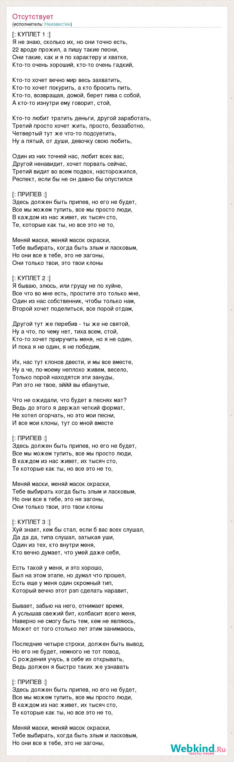 [: КУПЛЕТ 1 :] Я не знаю, сколько их, но они точно есть, 22 вроде прожил, а пишу такие песни, Они такие, как и я по характеру и хватке, Кто-то очень хороший, кто-то очень гадкий, Кто-то хочет вечно мир весь захватить, Кто-то хочет покурить, а кто бросить пить, Кто-то, возвращая, домой, берет пива с собой, А кто-то изнутри ему говорит, стой, Кто-то любит тратить деньги, другой заработать, Третий просто хочет жить, просто, беззаботно, Четвертый тут же что-то подсуетить, Ну а пятый, от души, девочку свою любить, Один из них точней нас, любит всех вас, Другой ненавидит, хочет порвать сейчас, Третий видит во всем подвох, насторожился, Респект, если бы не он давно бы опустился [: ПРИПЕВ :] Здесь должен быть припев, но его не будет, Все мы можем тупить, все мы просто люди, В каждом из нас живет, их тысяч сто, Те, которые как ты, но все это не то, Меняй маски, меняй масок окраски, Тебе выбирать, когда быть злым и ласковым, Но они все в тебе, это не загоны, Они только твои, это твои клоны [: КУПЛЕТ 2 :] Я бываю, злюсь, или грущу не по хуйне, Все что во мне есть, простите это только мне, Один из нас собственник, чтобы только нам, Второй хочет поделиться, все порой отдам, Другой тут же перебив - ты же не святой, Ну а что, по чему нет, тиха всем, стой, Кто-то хочет приручить меня, но я не один, И пока я не один, я не победим, Их, нас тут клонов двести, и мы все вместе, Ну а че, по-моему неплохо живем, весело, Только порой находятся эти зануды, Рэп это не твое, эййй вы ебанутые, Что не ожидали, что будет в песнях мат? Ведь до этого я держал четкий формат, Не хотел огорчать, но это мои песни, И все мои клоны, тут со мной вместе [: ПРИПЕВ :] Здесь должен быть припев, но его не будет, Все мы можем тупить, все мы просто люди, В каждом из нас живет, их тысяч сто, Те которые как ты, но все это не то, Меняй маски, меняй масок окраски, Тебе выбирать когда быть злым и ласковым, Но они все в тебе, это не загоны, Они только твои, это твои клоны [: КУПЛЕТ 3 :] Хуй знает, кем бы стал, если б вас всех слушал, Да да да, типа слушал, затыкая уши, Один из тех, кто внутри меня, Кто вечно думает, что умей даже себя, Есть такой у меня, и это хорошо, Был на этом этапе, но думал что прошел, Есть еще у меня один скромный тип, Который вечно этот рэп сделать наравит, Бывает, забью на него, отнимает время, А услышав свежий бит, колбасит всего меня, Наверно не смогу быть тем, кем не являюсь, Может от того столько лет этим занимаюсь, Последние четыре строки, должен быть вывод, Но его не будет, немного не тот повод, С рождения учусь, в себе их открывать, Ведь должен я быстро таких же узнавать [: ПРИПЕВ :] Здесь должен быть припев, но его не будет, Все мы можем тупить, все мы просто люди, В каждом из нас живет, их тысяч сто, Те которые как ты, но все это не то, Меняй маски, меняй масок окраски, Тебе выбирать, когда быть злым и ласковым, Но они все в тебе, это не загоны,