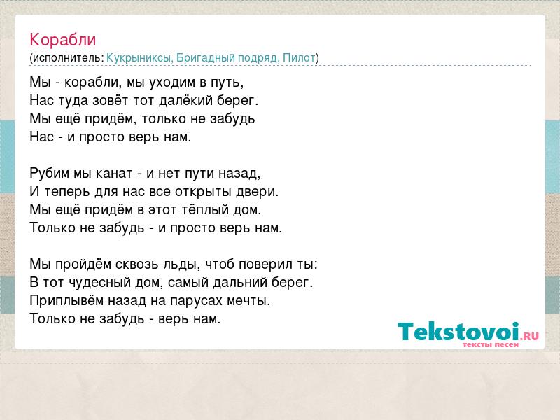 Мы - корабли, мы уходим в путь, Нас туда зовёт тот далёкий берег. Мы ещё придём, только не забудь Нас - и просто верь нам. Рубим мы канат - и нет пути назад, И теперь для нас все открыты двери. Мы ещё придём в этот тёплый дом. Только не забудь - и просто верь нам. Мы пройдём сквозь льды, чтоб поверил ты: В тот чудесный дом, самый дальний берег. Приплывём назад на парусах мечты. Только не забудь - верь нам.