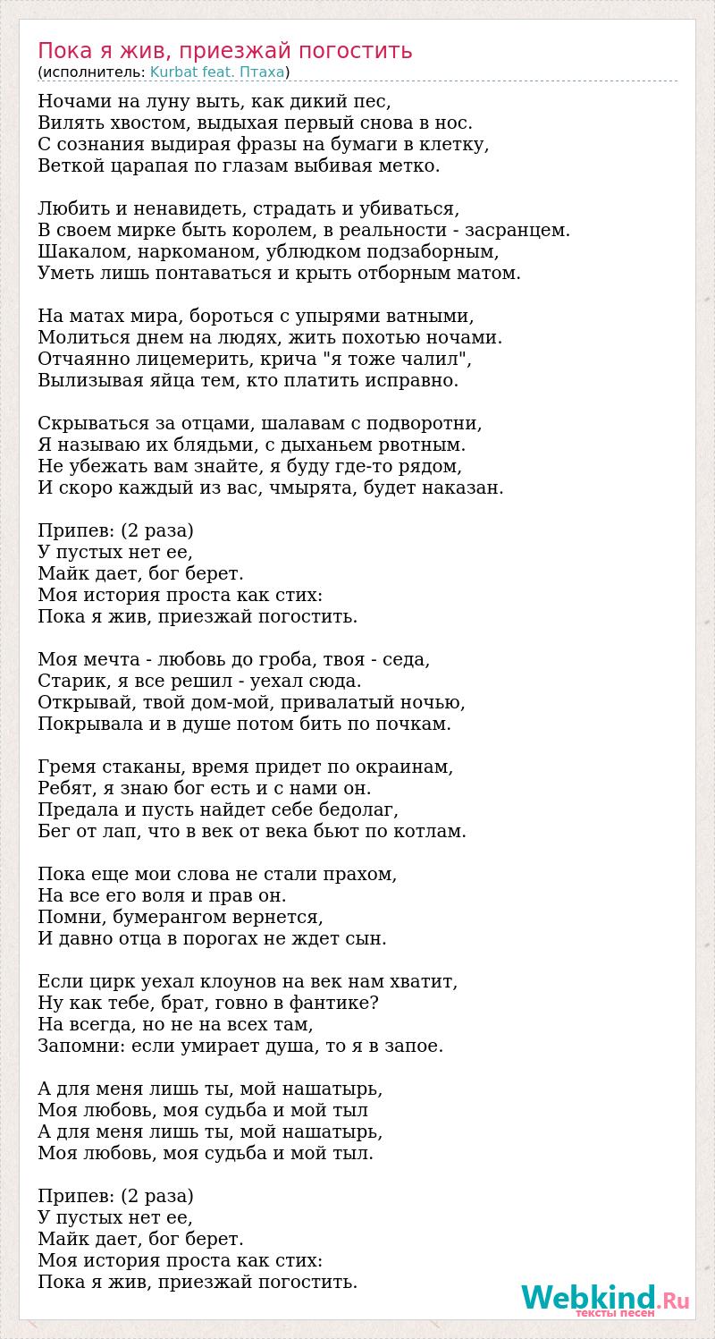 Ночами на луну выть, как дикий пес, Вилять хвостом, выдыхая первый снова в нос. С сознания выдирая фразы на бумаги в клетку, Веткой царапая по глазам выбивая метко. Любить и ненавидеть, страдать и убиваться, В своем мирке быть королем, в реальности - засранцем. Шакалом, наркоманом, ублюдком подзаборным, Уметь лишь понтаваться и крыть отборным матом. На матах мира, бороться с упырями ватными, Молиться днем на людях, жить похотью ночами. Отчаянно лицемерить, крича "я тоже чалил", Вылизывая яйца тем, кто платить исправно. Скрываться за отцами, шалавам с подворотни, Я называю их блядьми, с дыханьем рвотным. Не убежать вам знайте, я буду где-то рядом, И скоро каждый из вас, чмырята, будет наказан. Припев: (2 раза) У пустых нет ее, Майк дает, бог берет. Моя история проста как стих: Пока я жив, приезжай погостить. Моя мечта - любовь до гроба, твоя - седа, Старик, я все решил - уехал сюда. Открывай, твой дом-мой, привалатый ночью, Покрывала и в душе потом бить по почкам. Гремя стаканы, время придет по окраинам, Ребят, я знаю бог есть и с нами он. Предала и пусть найдет себе бедолаг, Бег от лап, что в век от века бьют по котлам. Пока еще мои слова не стали прахом, На все его воля и прав он. Помни, бумерангом вернется, И давно отца в порогах не ждет сын. Если цирк уехал клоунов на век нам хватит, Ну как тебе, брат, говно в фантике? На всегда, но не на всех там, Запомни: если умирает душа, то я в запое. А для меня лишь ты, мой нашатырь, Моя любовь, моя судьба и мой тыл А для меня лишь ты, мой нашатырь, Моя любовь, моя судьба и мой тыл. Припев: (2 раза) У пустых нет ее, Майк дает, бог берет. Моя история проста как стих: Пока я жив, приезжай погостить.