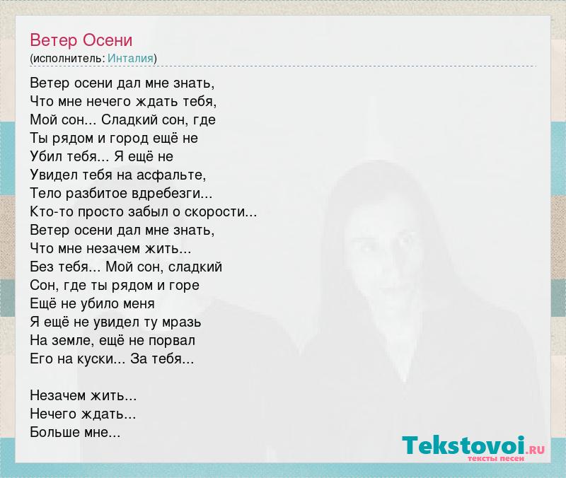 Ветер осени дал мне знать, Что мне нечего ждать тебя, Мой сон... Сладкий сон, где Ты рядом и город ещё не Убил тебя... Я ещё не Увидел тебя на асфальте, Тело разбитое вдребезги... Кто-то просто забыл о скорости... Ветер осени дал мне знать, Что мне незачем жить... Без тебя... Мой сон, сладкий Сон, где ты рядом и горе Ещё не убило меня Я ещё не увидел ту мразь На земле, ещё не порвал Его на куски... За тебя... Незачем жить... Нечего ждать... Больше мне...