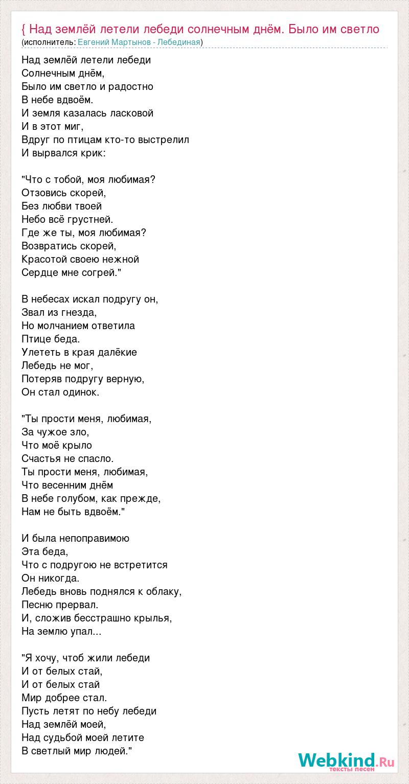Над землёй летели лебеди Солнечным днём, Было им светло и радостно В небе вдвоём. И земля казалась ласковой И в этот миг, Вдруг по птицам кто-то выстрелил И вырвался крик: "Что с тобой, моя любимая? Отзовись скорей, Без любви твоей Небо всё грустней. Где же ты, моя любимая? Возвратись скорей, Красотой своею нежной Сердце мне согрей." В небесах искал подругу он, Звал из гнезда, Но молчанием ответила Птице беда. Улететь в края далёкие Лебедь не мог, Потеряв подругу верную, Он стал одинок. "Ты прости меня, любимая, За чужое зло, Что моё крыло Счастья не спасло. Ты прости меня, любимая, Что весенним днём В небе голубом, как прежде, Нам не быть вдвоём." И была непоправимою Эта беда, Что с подругою не встретится Он никогда. Лебедь вновь поднялся к облаку, Песню прервал. И, сложив бесстрашно крылья, На землю упал... "Я хочу, чтоб жили лебеди И от белых стай, И от белых стай Мир добрее стал. Пусть летят по небу лебеди Над землёй моей, Над судьбой моей летите В светлый мир людей."