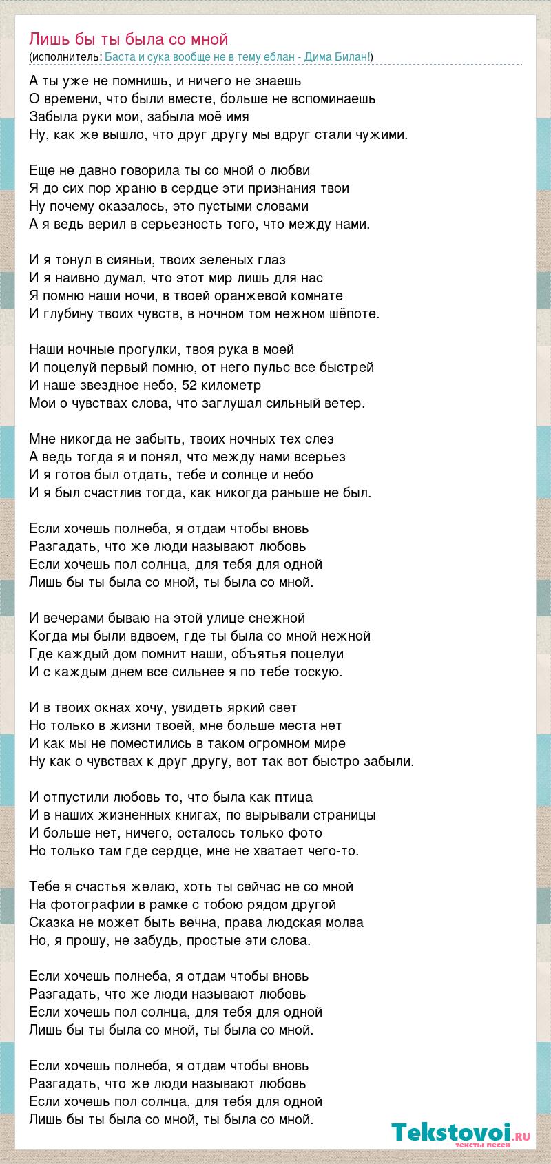 А ты уже не помнишь, и ничего не знаешь О времени, что были вместе, больше не вспоминаешь Забыла руки мои, забыла моё имя Ну, как же вышло, что друг другу мы вдруг стали чужими. Еще не давно говорила ты со мной о любви Я до сих пор храню в сердце эти признания твои Ну почему оказалось, это пустыми словами А я ведь верил в серьезность того, что между нами. И я тонул в сияньи, твоих зеленых глаз И я наивно думал, что этот мир лишь для нас Я помню наши ночи, в твоей оранжевой комнате И глубину твоих чувств, в ночном том нежном шёпоте. Наши ночные прогулки, твоя рука в моей И поцелуй первый помню, от него пульс все быстрей И наше звездное небо, 52 километр Мои о чувствах слова, что заглушал сильный ветер. Мне никогда не забыть, твоих ночных тех слез А ведь тогда я и понял, что между нами всерьез И я готов был отдать, тебе и солнце и небо И я был счастлив тогда, как никогда раньше не был. Если хочешь полнеба, я отдам чтобы вновь Разгадать, что же люди называют любовь Если хочешь пол солнца, для тебя для одной Лишь бы ты была со мной, ты была со мной. И вечерами бываю на этой улице снежной Когда мы были вдвоем, где ты была со мной нежной Где каждый дом помнит наши, объятья поцелуи И с каждым днем все сильнее я по тебе тоскую. И в твоих окнах хочу, увидеть яркий свет Но только в жизни твоей, мне больше места нет И как мы не поместились в таком огромном мире Ну как о чувствах к друг другу, вот так вот быстро забыли. И отпустили любовь то, что была как птица И в наших жизненных книгах, по вырывали страницы И больше нет, ничего, осталось только фото Но только там где сердце, мне не хватает чего-то. Тебе я счастья желаю, хоть ты сейчас не со мной На фотографии в рамке с тобою рядом другой Сказка не может быть вечна, права людская молва Но, я прошу, не забудь, простые эти слова. Если хочешь полнеба, я отдам чтобы вновь Разгадать, что же люди называют любовь Если хочешь пол солнца, для тебя для одной Лишь бы ты была со мной, ты была со мной. Если хочешь полнеба, я отдам чтобы вновь Разгадать, что же люди называют любовь Если хочешь пол солнца, для тебя для одной Лишь бы ты была со мной, ты была со мной.