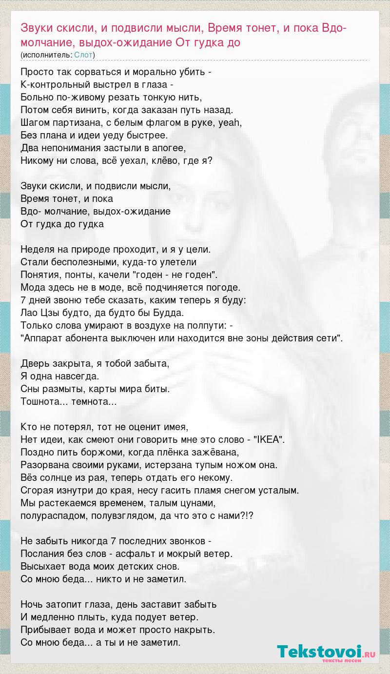 Главная→Исполнители→Слот→Звуки скисли, и подвисли мысли, Время тонет, и пока Вдо- молчание, выдох-ожидан