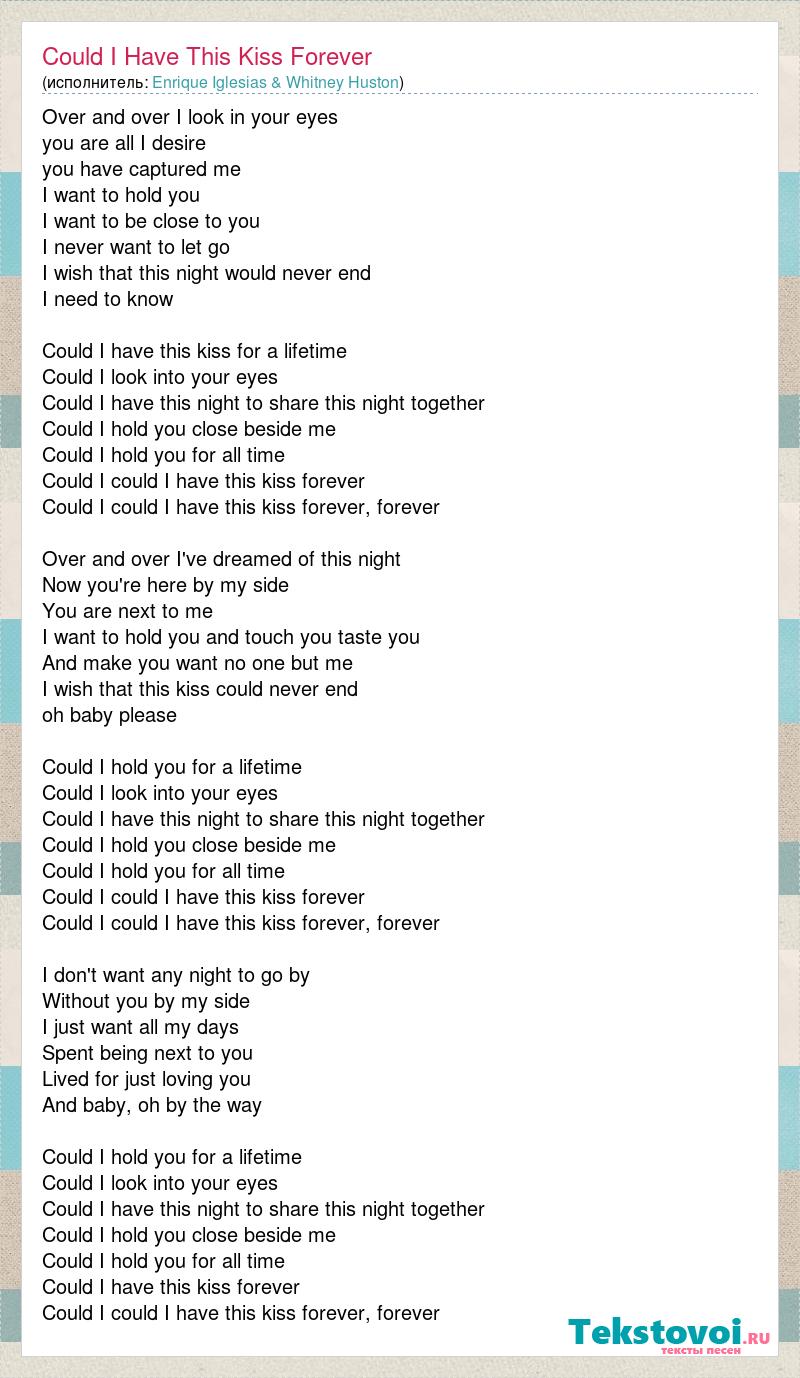 Over and over I look in your eyes you are all I desire you have captured me I want to hold you I want to be close to you I never want to let go I wish that this night would never end I need to know Could I have this kiss for a lifetime Could I look into your eyes Could I have this night to share this night together Could I hold you close beside me Could I hold you for all time Could I could I have this kiss forever Could I could I have this kiss forever, forever Over and over I've dreamed of this night Now you're here by my side You are next to me I want to hold you and touch you taste you And make you want no one but me I wish that this kiss could never end oh baby please Could I hold you for a lifetime Could I look into your eyes Could I have this night to share this night together Could I hold you close beside me Could I hold you for all time Could I could I have this kiss forever Could I could I have this kiss forever, forever I don't want any night to go by Without you by my side I just want all my days Spent being next to you Lived for just loving you And baby, oh by the way Could I hold you for a lifetime Could I look into your eyes Could I have this night to share this night together Could I hold you close beside me Could I hold you for all time Could I have this kiss forever Could I could I have this kiss forever, forever