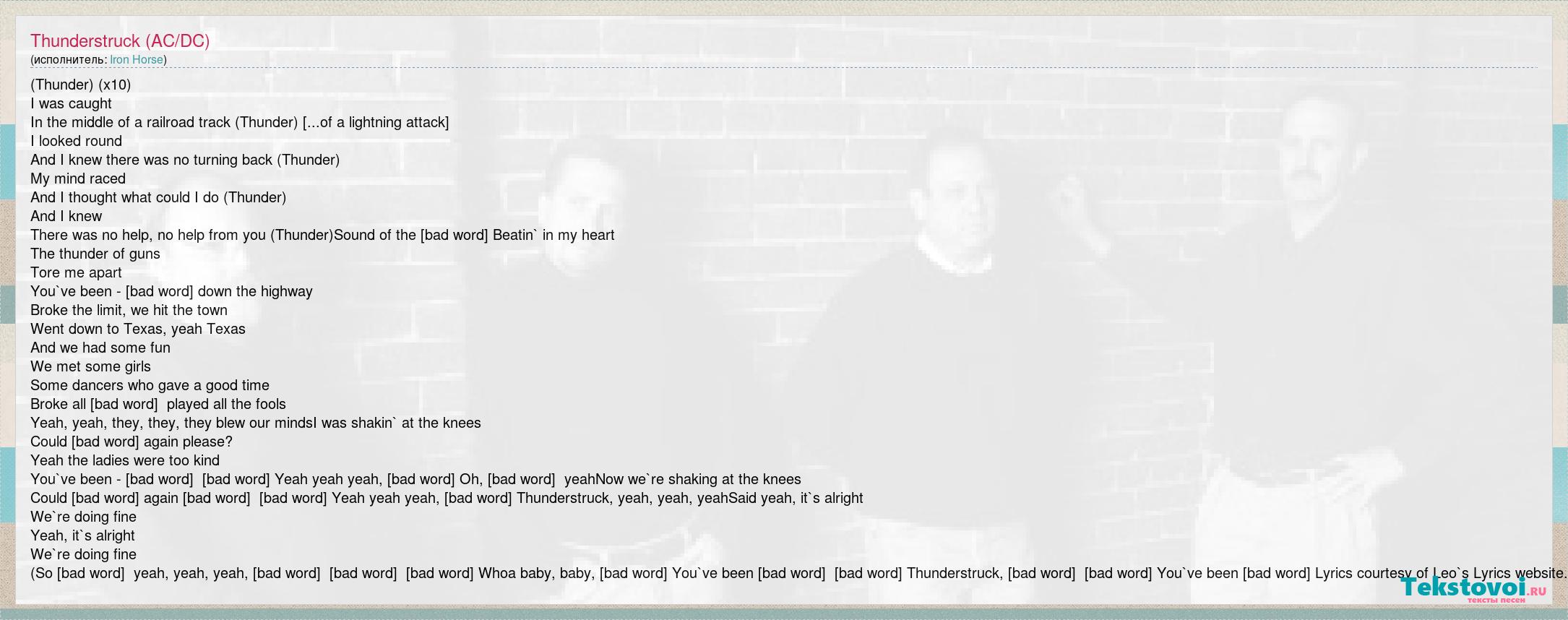 (Thunder) (x10) I was caught In the middle of a railroad track (Thunder) [...of a lightning attack] I looked round And I knew there was no turning back (Thunder) My mind raced And I thought what could I do (Thunder) And I knew There was no help, no help from you (Thunder)Sound of the drums Beatin` in my heart The thunder of guns Tore me apart You`ve been - thunderstruckRode down the highway Broke the limit, we hit the town Went down to Texas, yeah Texas And we had some fun We met some girls Some dancers who gave a good time Broke all the rules, played all the fools Yeah, yeah, they, they, they blew our mindsI was shakin` at the knees Could I come again please? Yeah the ladies were too kind You`ve been - thunderstruck, thunderstruck Yeah yeah yeah, thunderstruckYeah Oh, thunderstruck, yeahNow we`re shaking at the knees Could I come again please?Thunderstruck, thunderstruck Yeah yeah yeah, thunderstruck Thunderstruck, yeah, yeah, yeahSaid yeah, it`s alright We`re doing fine Yeah, it`s alright We`re doing fine (So fine)Thunderstruck, yeah, yeah, yeah, Tunderstruck, thunderstruck, thunderstruck Whoa baby, baby, thunderstruck You`ve been thunderstruck, thunderstruck Thunderstruck, thunderstruck, thunderstruck You`ve been thunderstruck Lyrics courtesy of Leo`s Lyrics website.