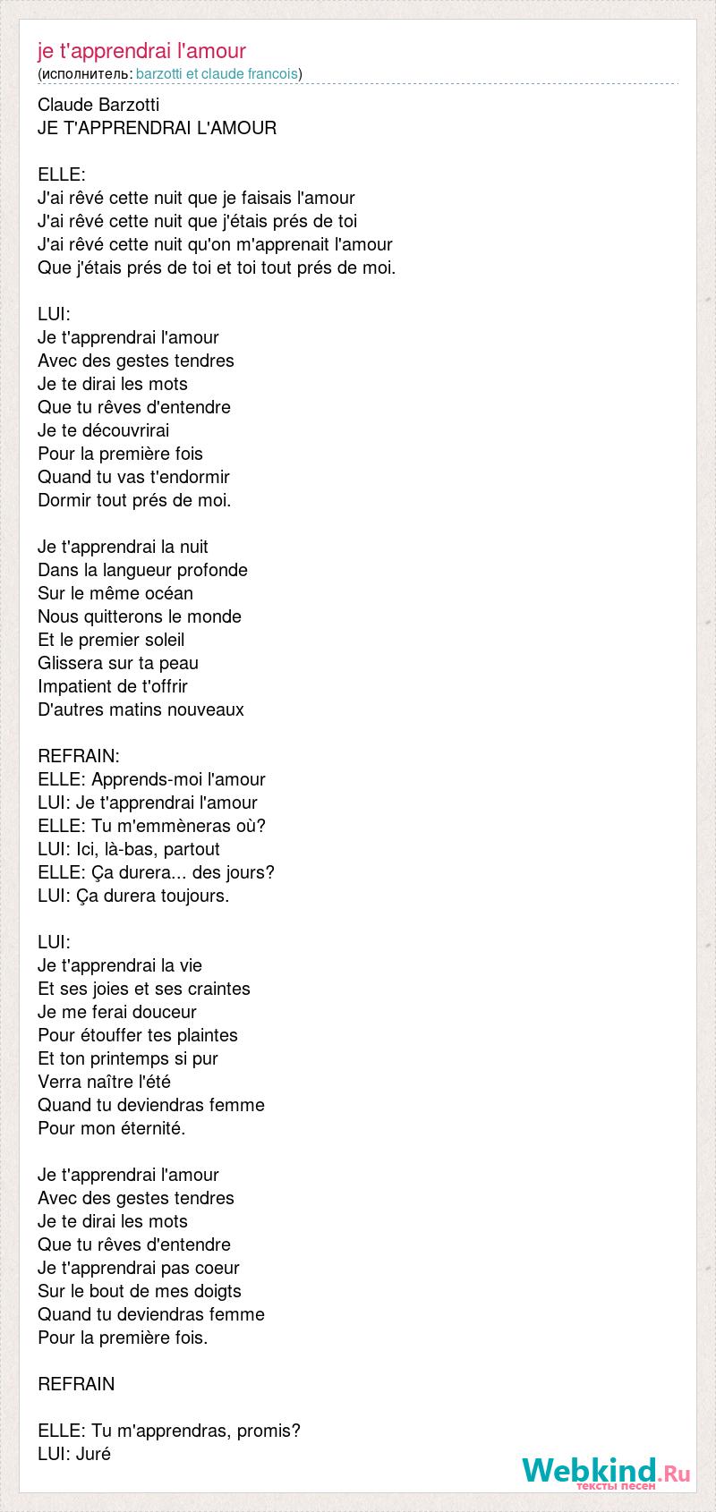 Claude Barzotti JE T'APPRENDRAI L'AMOUR ELLE: J'ai rêvé cette nuit que je faisais l'amour J'ai rêvé cette nuit que j'étais prés de toi J'ai rêvé cette nuit qu'on m'apprenait l'amour Que j'étais prés de toi et toi tout prés de moi. LUI: Je t'apprendrai l'amour Avec des gestes tendres Je te dirai les mots Que tu rêves d'entendre Je te découvrirai Pour la première fois Quand tu vas t'endormir Dormir tout prés de moi. Je t'apprendrai la nuit Dans la langueur profonde Sur le même océan Nous quitterons le monde Et le premier soleil Glissera sur ta peau Impatient de t'offrir D'autres matins nouveaux REFRAIN: ELLE: Apprends-moi l'amour LUI: Je t'apprendrai l'amour ELLE: Tu m'emmèneras où? LUI: Ici, là-bas, partout ELLE: Ça durera... des jours? LUI: Ça durera toujours. LUI: Je t'apprendrai la vie Et ses joies et ses craintes Je me ferai douceur Pour étouffer tes plaintes Et ton printemps si pur Verra naître l'été Quand tu deviendras femme Pour mon éternité. Je t'apprendrai l'amour Avec des gestes tendres Je te dirai les mots Que tu rêves d'entendre Je t'apprendrai pas coeur Sur le bout de mes doigts Quand tu deviendras femme Pour la première fois. REFRAIN ELLE: Tu m'apprendras, promis? LUI: Juré