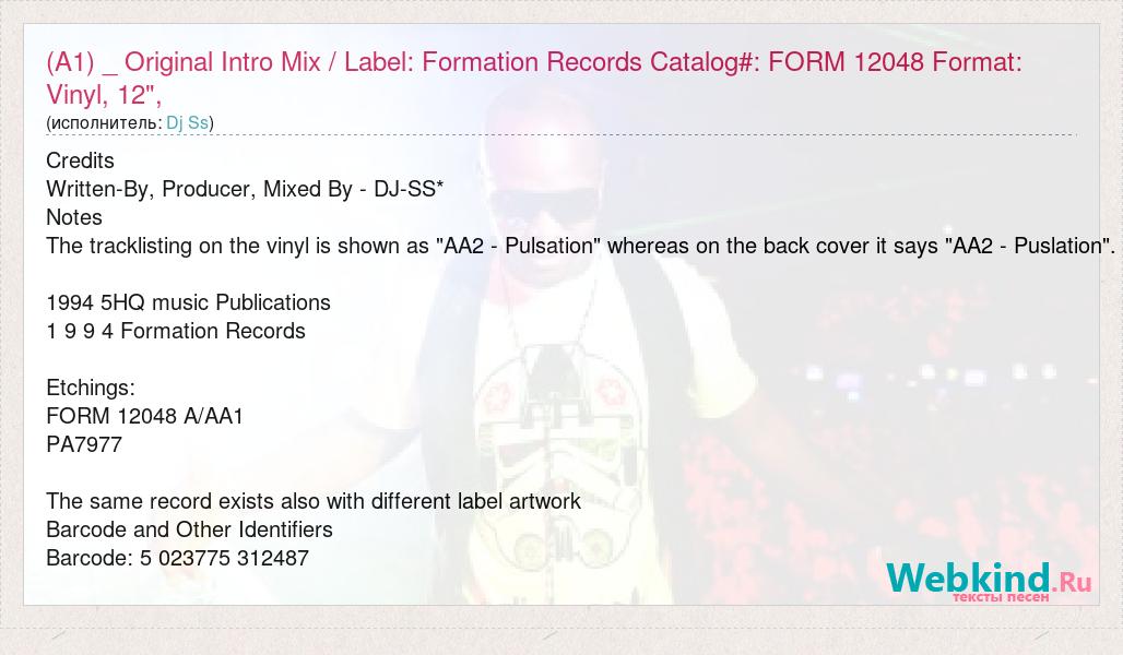 Credits Written-By, Producer, Mixed By - DJ-SS* Notes The tracklisting on the vinyl is shown as "AA2 - Pulsation" whereas on the back cover it says "AA2 - Puslation". 1994 5HQ music Publications 1 9 9 4 Formation Records Etchings: FORM 12048 A/AA1 PA7977 The same record exists also with different label artwork Barcode and Other Identifiers Barcode: 5 023775 312487