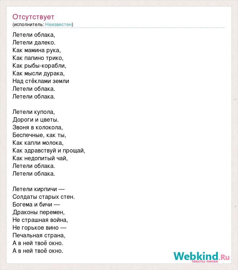 Летели облака, Летели далеко. Как мамина рука, Как папино трико, Как рыбы-корабли, Как мысли дурака, Над стёклами земли Летели облака. Летели облака. Летели купола, Дороги и цветы. Звоня в колокола, Беспечные, как ты, Как капли молока, Как здравствуй и прощай, Как недопитый чай, Летели облака. Летели облака. Летели кирпичи — Солдаты старых стен. Богема и бичи — Драконы перемен, Не страшная война, Не горькое вино — Печальная страна, А в ней твоё окно. А в ней твоё окно.
