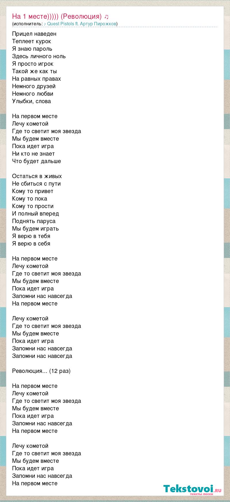 Прицел наведен Теплеет курок Я знаю пароль Здесь личного ноль Я просто игрок Такой же как ты На равных правах Немного друзей Немного любви Улыбки, слова На первом месте Лечу кометой Где то светит моя звезда Мы будем вместе Пока идет игра Ни кто не знает Что будет дальше Остаться в живых Не сбиться с пути Кому то привет Кому то пока Кому то прости И полный вперед Поднять паруса Мы будем играть Я верю в тебя Я верю в себя На первом месте Лечу кометой Где то светит моя звезда Мы будем вместе Пока идет игра Запомни нас навсегда На первом месте Лечу кометой Где то светит моя звезда Мы будем вместе Пока идет игра Запомни нас навсегда Запомни нас навсегда Революция... (12 раз) На первом месте Лечу кометой Где то светит моя звезда Мы будем вместе Пока идет игра Запомни нас навсегда На первом месте Лечу кометой Где то светит моя звезда Мы будем вместе Пока идет игра Запомни нас навсегда На первом месте