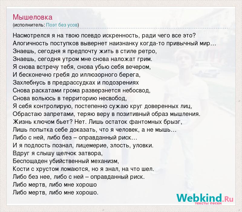 Насмотрелся я на твою псевдо искренность, ради чего все это? Алогичность поступков вывернет наизнанку когда-то привычный мир… Знаешь, сегодня я предпочту жить в стиле ретро, Знаешь, сегодня утром мне снова наложат грим. Я снова встречу тебя, снова убью себя вечером, И бесконечно гребя до иллюзорного берега, Захлебнусь в предрассудках и подозрениях Снова раскатами грома разверзнется небосвод, Снова вольюсь в территорию несвобод, Я себя контролирую, постепенно сужаю круг доверенных лиц, Обрастаю запретами, теряю веру в позитивный образ мышления. Жизнь ключом бьет? Нет. Лишь остаток фантомных брызг, Лишь попытка себе доказать, что я человек, а не мышь… Либо с ней, либо без – оправданный риск… И я подлость познал, лицемерие, злость, уловки. Вдруг я слышу щелчок затвора, Беспощаден убийственный механизм, Кости с хрустом ломаются, но я знал, на что шел. Либо без нее, либо с ней – оправданный риск. Либо мертв, либо мне хорошо Либо мертв, либо мне хорошо.