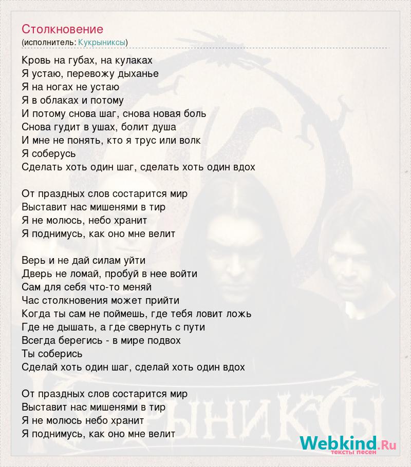 Кровь на губах, на кулаках Я устаю, перевожу дыханье Я на ногах не устаю Я в облаках и потому И потому снова шаг, снова новая боль Снова гудит в ушах, болит душа И мне не понять, кто я трус или волк Я соберусь Сделать хоть один шаг, сделать хоть один вдох От праздных слов состарится мир Выставит нас мишенями в тир Я не молюсь, небо хранит Я поднимусь, как оно мне велит Верь и не дай силам уйти Дверь не ломай, пробуй в нее войти Сам для себя что-то меняй Час столкновения может прийти Когда ты сам не поймешь, где тебя ловит ложь Где не дышать, а где свернуть с пути Всегда берегись - в мире подвох Ты соберись Сделай хоть один шаг, сделай хоть один вдох От праздных слов состарится мир Выставит нас мишенями в тир Я не молюсь небо хранит Я поднимусь, как оно мне велит