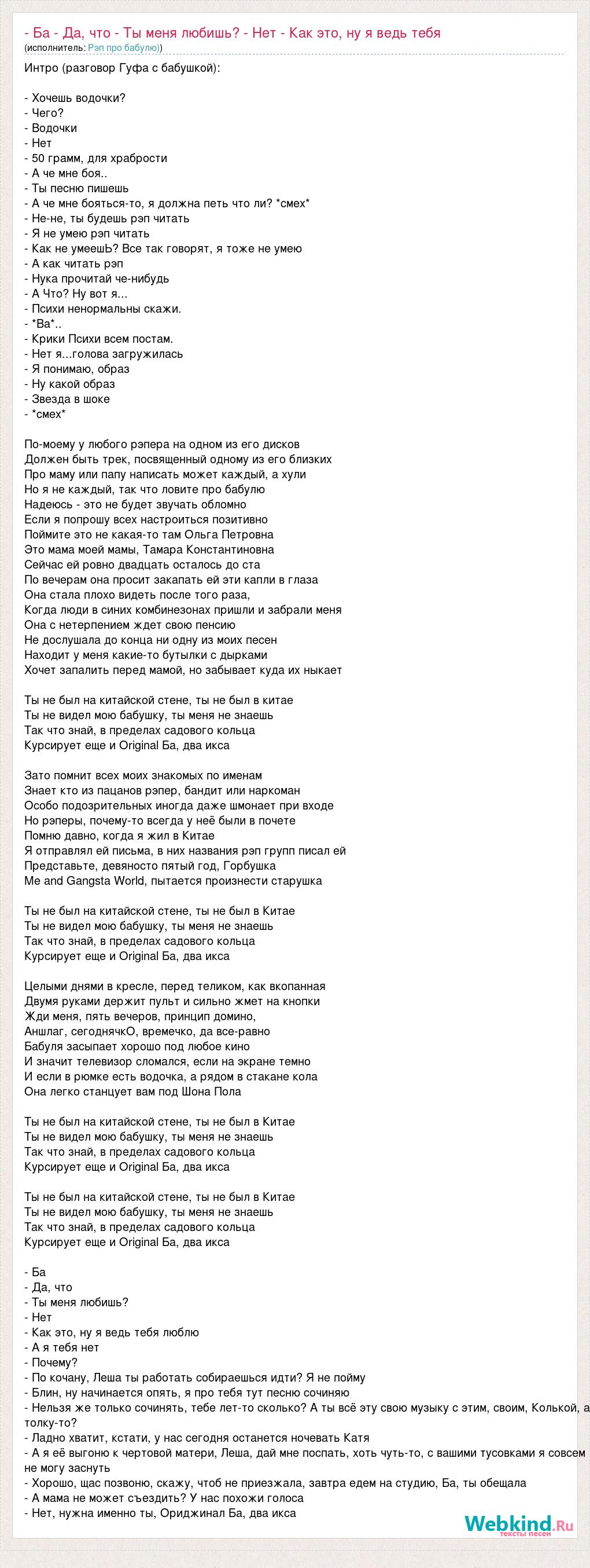 Интро (разговор Гуфа с бабушкой): - Хочешь водочки? - Чего? - Водочки - Нет - 50 грамм, для храбрости - А че мне боя.. - Ты песню пишешь - А че мне бояться-то, я должна петь что ли? *смех* - Не-не, ты будешь рэп читать - Я не умею рэп читать - Как не умеешЬ? Все так говорят, я тоже не умею - А как читать рэп - Нука прочитай че-нибудь - А Что? Ну вот я... - Психи ненормальны скажи. - *Ва*.. - Крики Психи всем постам. - Нет я...голова загружилась - Я понимаю, образ - Ну какой образ - Звезда в шоке - *смех* По-моему у любого рэпера на одном из его дисков Должен быть трек, посвященный одному из его близких Про маму или папу написать может каждый, а хули Но я не каждый, так что ловите про бабулю Надеюсь - это не будет звучать обломно Если я попрошу всех настроиться позитивно Поймите это не какая-то там Ольга Петровна Это мама моей мамы, Тамара Константиновна Сейчас ей ровно двадцать осталось до ста По вечерам она просит закапать ей эти капли в глаза Она стала плохо видеть после того раза, Когда люди в синих комбинезонах пришли и забрали меня Она с нетерпением ждет свою пенсию Не дослушала до конца ни одну из моих песен Находит у меня какие-то бутылки с дырками Хочет запалить перед мамой, но забывает куда их ныкает Ты не был на китайской стене, ты не был в китае Ты не видел мою бабушку, ты меня не знаешь Так что знай, в пределах садового кольца Курсирует еще и Original Ба, два икса Зато помнит всех моих знакомых по именам Знает кто из пацанов рэпер, бандит или наркоман Особо подозрительных иногда даже шмонает при входе Но рэперы, почему-то всегда у неё были в почете Помню давно, когда я жил в Китае Я отправлял ей письма, в них названия рэп групп писал ей Представьте, девяносто пятый год, Горбушка Me and Gangsta World, пытается произнести старушка Ты не был на китайской стене, ты не был в Китае Ты не видел мою бабушку, ты меня не знаешь Так что знай, в пределах садового кольца Курсирует еще и Original Ба, два икса Целыми днями в кресле, перед теликом, как вкопанная Двумя руками держит пульт и сильно жмет на кнопки Жди меня, пять вечеров, принцип домино, Аншлаг, сегоднячкО, времечко, да все-равно Бабуля засыпает хорошо под любое кино И значит телевизор сломался, если на экране темно И если в рюмке есть водочка, а рядом в стакане кола Она легко станцует вам под Шона Пола Ты не был на китайской стене, ты не был в Китае Ты не видел мою бабушку, ты меня не знаешь Так что знай, в пределах садового кольца Курсирует еще и Original Ба, два икса Ты не был на китайской стене, ты не был в Китае Ты не видел мою бабушку, ты меня не знаешь Так что знай, в пределах садового кольца Курсирует еще и Original Ба, два икса - Ба - Да, что - Ты меня любишь? - Нет - Как это, ну я ведь тебя люблю - А я тебя нет - Почему? - По кочану, Леша ты работать собираешься идти? Я не пойму - Блин, ну начинается опять, я про тебя тут песню сочиняю - Нельзя же только сочинять, тебе лет-то сколько? А ты всё эту свою музыку с этим, своим, Колькой, а толку-то? - Ладно хватит, кстати, у нас сегодня останется ночевать Катя - А я её выгоню к чертовой матери, Леша, дай мне поспать, хоть чуть-то, с вашими тусовками я совсем не могу заснуть - Хорошо, щас позвоню, скажу, чтоб не приезжала, завтра едем на студию, Ба, ты обещала - А мама не может съездить? У нас похожи голоса - Нет, нужна именно ты, Ориджинал Ба, два икса