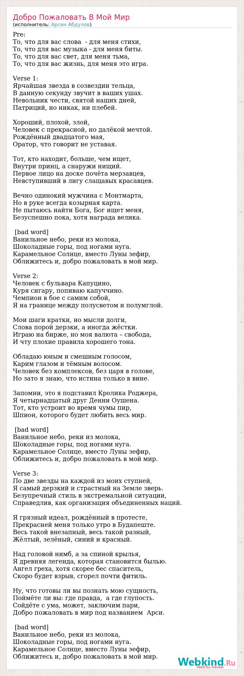 Pre: То, что для вас слова - для меня стихи, То, что для вас музыка - для меня биты. То, что для вас свет, для меня тьма, То, что для вас жизнь, для меня это игра. Verse 1: Ярчайшая звезда в созвездии тельца, В данную секунду звучит в ваших ушах. Невольник чести, святой наших дней, Патриций, но никак, ни плебей. Хороший, плохой, злой, Человек с прекрасной, но далёкой мечтой. Рождённый двадцатого мая, Оратор, что говорит не уставая. Тот, кто находит, больше, чем ищет, Внутри принц, а снаружи нищий. Первое лицо на доске почёта мерзавцев, Невступивший в лигу слащавых красавцев. Вечно одинокий мужчина с Монтмарта, Но в руке всегда козырная карта. Не пытаюсь найти Бога, Бог ищет меня, Безуспешно пока, хотя награда велика. [bad word] Ванильное небо, реки из молока, Шоколадные горы, под ногами нуга. Карамельное Солнце, вместо Луны зефир, Оближитесь и, добро пожаловать в мой мир. Verse 2: Человек с бульвара Капуцино, Куря сигару, попиваю капуччино. Чемпион в бое с самим собой, Я на границе между полусветом и полумглой. Мои шаги кратки, но мысли долги, Слова порой дерзки, а иногда жёстки. Играю на бирже, но моя валюта – свобода, И чту плохие правила хорошего тона. Обладаю юным и смешным голосом, Карим глазом и тёмным волосом. Человек без комплексов, без царя в голове, Но зато я знаю, что истина только в вине. Запомни, это я подставил Кролика Роджера, Я четырнадцатый друг Денни Оушена. Тот, кто устроит во время чумы пир, Шпион, которого будет любить весь мир. [bad word] Ванильное небо, реки из молока, Шоколадные горы, под ногами нуга. Карамельное Солнце, вместо Луны зефир, Оближитесь и, добро пожаловать в мой мир. Verse 3: По две звезды на каждой из моих ступней, Я самый дерзкий и страстный на Земле зверь. Безупречный стиль в экстремальной ситуации, Справедлив, как организация объединенных наций. Я грязный идеал, рождённый в протесте, Прекрасней меня только утро в Будапеште. Весь такой внезапный, весь такой разный, Жёлтый, зелёный, синий и красный. Над головой нимб, а за спиной крылья, Я древняя легенда, которая становится былью. Ангел греха, хотя скорее бес спаситель, Скоро будет взрыв, сгорел почти фитиль. Ну, что готовы ли вы познать мою сущность, Поймёте ли вы: где правда, а где глупость. Сойдёте с ума, может, заключим пари, Добро пожаловать в мир под названием Арси. [bad word] Ванильное небо, реки из молока, Шоколадные горы, под ногами нуга. Карамельное Солнце, вместо Луны зефир, Оближитесь и, добро пожаловать в мой мир.
