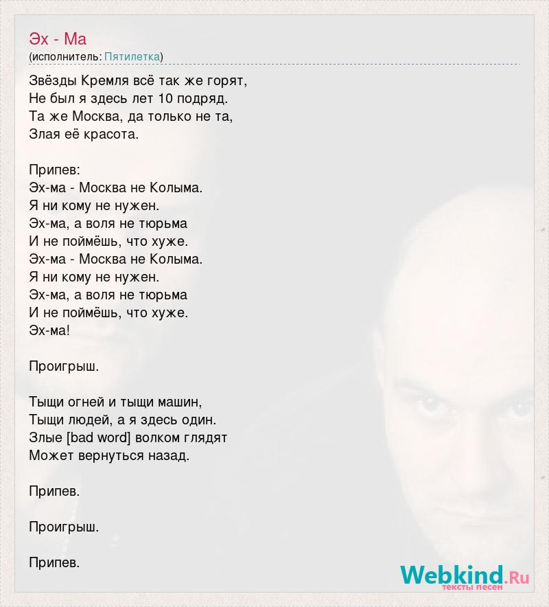 Звёзды Кремля всё так же горят, Не был я здесь лет 10 подряд. Та же Москва, да только не та, Злая её красота. Припев: Эх-ма - Москва не Колыма. Я ни кому не нужен. Эх-ма, а воля не тюрьма И не поймёшь, что хуже. Эх-ма - Москва не Колыма. Я ни кому не нужен. Эх-ма, а воля не тюрьма И не поймёшь, что хуже. Эх-ма! Проигрыш. Тыщи огней и тыщи машин, Тыщи людей, а я здесь один. Злые [bad word] волком глядят Может вернуться назад. Припев. Проигрыш. Припев.
