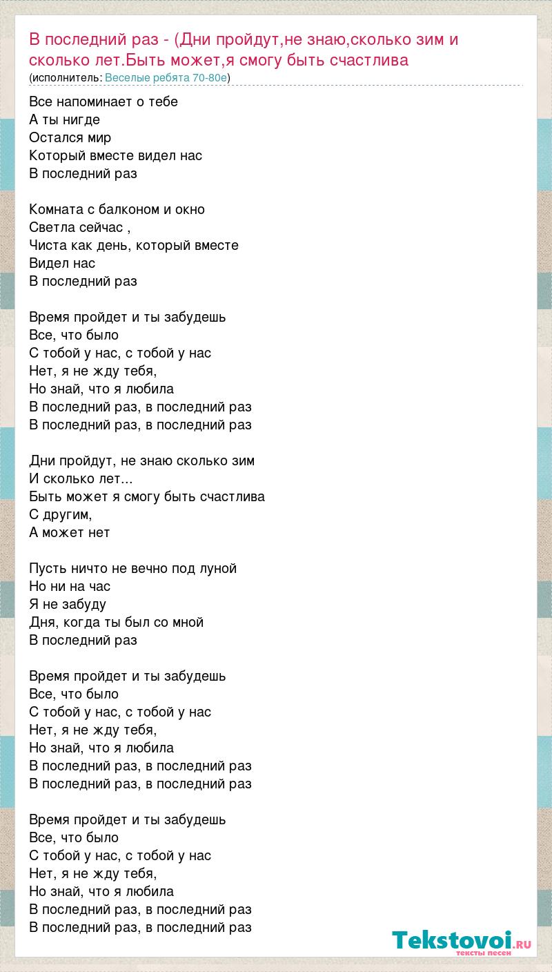 Главная→Исполнители→Веселые ребята 70-80е→В последний раз - (Дни пройдут,не знаю,сколько зим и сколько лет.Быть может,я см