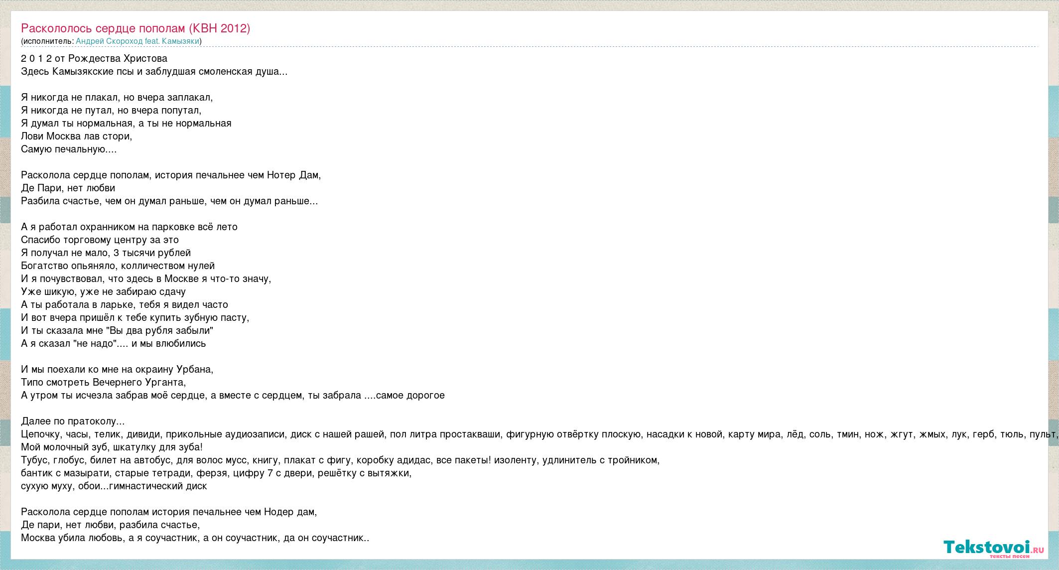 2 0 1 2 от Рождества Христова Здесь Камызякские псы и заблудшая смоленская душа... Я никогда не плакал, но вчера заплакал, Я никогда не путал, но вчера попутал, Я думал ты нормальная, а ты не нормальная Лови Москва лав стори, Самую печальную.... Расколола сердце пополам, история печальнее чем Нотер Дам, Де Пари, нет любви Разбила счастье, чем он думал раньше, чем он думал раньше... А я работал охранником на парковке всё лето Спасибо торговому центру за это Я получал не мало, 3 тысячи рублей Богатство опьяняло, колличеством нулей И я почувствовал, что здесь в Москве я что-то значу, Уже шикую, уже не забираю сдачу А ты работала в ларьке, тебя я видел часто И вот вчера пришёл к тебе купить зубную пасту, И ты сказала мне "Вы два рубля забыли" А я сказал "не надо".... и мы влюбились И мы поехали ко мне на окраину Урбана, Типо смотреть Вечернего Урганта, А утром ты исчезла забрав моё сердце, а вместе с сердцем, ты забрала ....самое дорогое Далее по пратоколу... Цепочку, часы, телик, дивиди, прикольные аудиозаписи, диск с нашей рашей, пол литра простакваши, фигурную отвёртку плоскую, насадки к новой, карту мира, лёд, соль, тмин, нож, жгут, жмых, лук, герб, тюль, пульт, Мой молочный зуб, шкатулку для зуба! Тубус, глобус, билет на автобус, для волос мусс, книгу, плакат с фигу, коробку адидас, все пакеты! изоленту, удлинитель с тройником, бантик с мазырати, старые тетради, ферзя, цифру 7 с двери, решётку с вытяжки, сухую муху, обои...гимнастический диск Расколола сердце пополам история печальнее чем Нодер дам, Де пари, нет любви, разбила счастье, Москва убила любовь, а я соучастник, а он соучастник, да он соучастник..