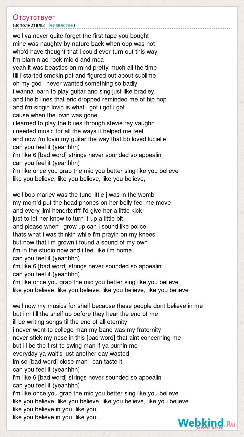 well ya never quite forget the first tape you bought mine was naughty by nature back when opp was hot who'd have thought that i could ever turn out this way i'm blamin ad rock mic d and mca yeah it was beasties on mind pretty much all the time till i started smokin pot and figured out about sublime oh my god i never wanted something so badly i wanna learn to play guitar and sing just like bradley and the b lines that eric dropped reminded me of hip hop and i'm singin lovin is what i got i got i got cause when the lovin was gone i learned to play the blues through stevie ray vaughn i needed music for all the ways it helped me feel and now i'm lovin my guitar the way that bb loved lucielle can you feel it (yeahhhh) i'm like 6 [bad word] strings never sounded so appealin can you feel it (yeahhhh) i'm like once you grab the mic you better sing like you believe like you believe, like you believe, like you believe, well bob marley was the tune little j was in the womb my mom'd put the head phones on her belly feel me move and every jimi hendrix riff i'd give her a little kick just to let her know to turn it up a little bit and please when i grow up can i sound like police thats what i was thinkin while i'm prayin on my knees but now that i'm grown i found a sound of my own i'm in the studio now and i feel like i'm home can you feel it (yeahhhh) i'm like 6 [bad word] strings never sounded so appealin can you feel it (yeahhhh) i'm like once you grab the mic you better sing like you believe like you believe, like you believe, like you believe, like you believe well now my musics for shelf because these people dont believe in me but i'm fill the shelf up before they hear the end of me ill be writing songs til the end of all eternity i never went to college man my band was my fraternity never stick my nose in this [bad word] that aint concerning me but ill be the first to swing man if ya burnin me everyday ya wait's just another day wasted im so [bad word] close man i can taste it can you feel it (yeahhhh) i'm like 6 [bad word] strings never sounded so appealin can you feel it (yeahhhh) i'm like once you grab the mic you better sing like you believe like you believe, like you believe, like you believe, like you believe like you believe in you, like you, like you believe in you, like you...