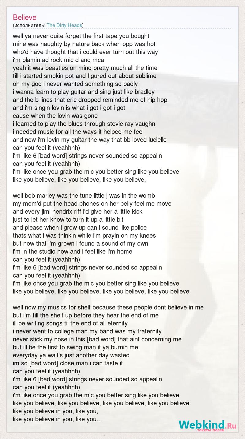well ya never quite forget the first tape you bought mine was naughty by nature back when opp was hot who'd have thought that i could ever turn out this way i'm blamin ad rock mic d and mca yeah it was beasties on mind pretty much all the time till i started smokin pot and figured out about sublime oh my god i never wanted something so badly i wanna learn to play guitar and sing just like bradley and the b lines that eric dropped reminded me of hip hop and i'm singin lovin is what i got i got i got cause when the lovin was gone i learned to play the blues through stevie ray vaughn i needed music for all the ways it helped me feel and now i'm lovin my guitar the way that bb loved lucielle can you feel it (yeahhhh) i'm like 6 [bad word] strings never sounded so appealin can you feel it (yeahhhh) i'm like once you grab the mic you better sing like you believe like you believe, like you believe, like you believe, well bob marley was the tune little j was in the womb my mom'd put the head phones on her belly feel me move and every jimi hendrix riff i'd give her a little kick just to let her know to turn it up a little bit and please when i grow up can i sound like police thats what i was thinkin while i'm prayin on my knees but now that i'm grown i found a sound of my own i'm in the studio now and i feel like i'm home can you feel it (yeahhhh) i'm like 6 [bad word] strings never sounded so appealin can you feel it (yeahhhh) i'm like once you grab the mic you better sing like you believe like you believe, like you believe, like you believe, like you believe well now my musics for shelf because these people dont believe in me but i'm fill the shelf up before they hear the end of me ill be writing songs til the end of all eternity i never went to college man my band was my fraternity never stick my nose in this [bad word] that aint concerning me but ill be the first to swing man if ya burnin me everyday ya wait's just another day wasted im so [bad word] close man i can taste it can you feel it (yeahhhh) i'm like 6 [bad word] strings never sounded so appealin can you feel it (yeahhhh) i'm like once you grab the mic you better sing like you believe like you believe, like you believe, like you believe, like you believe like you believe in you, like you, like you believe in you, like you...