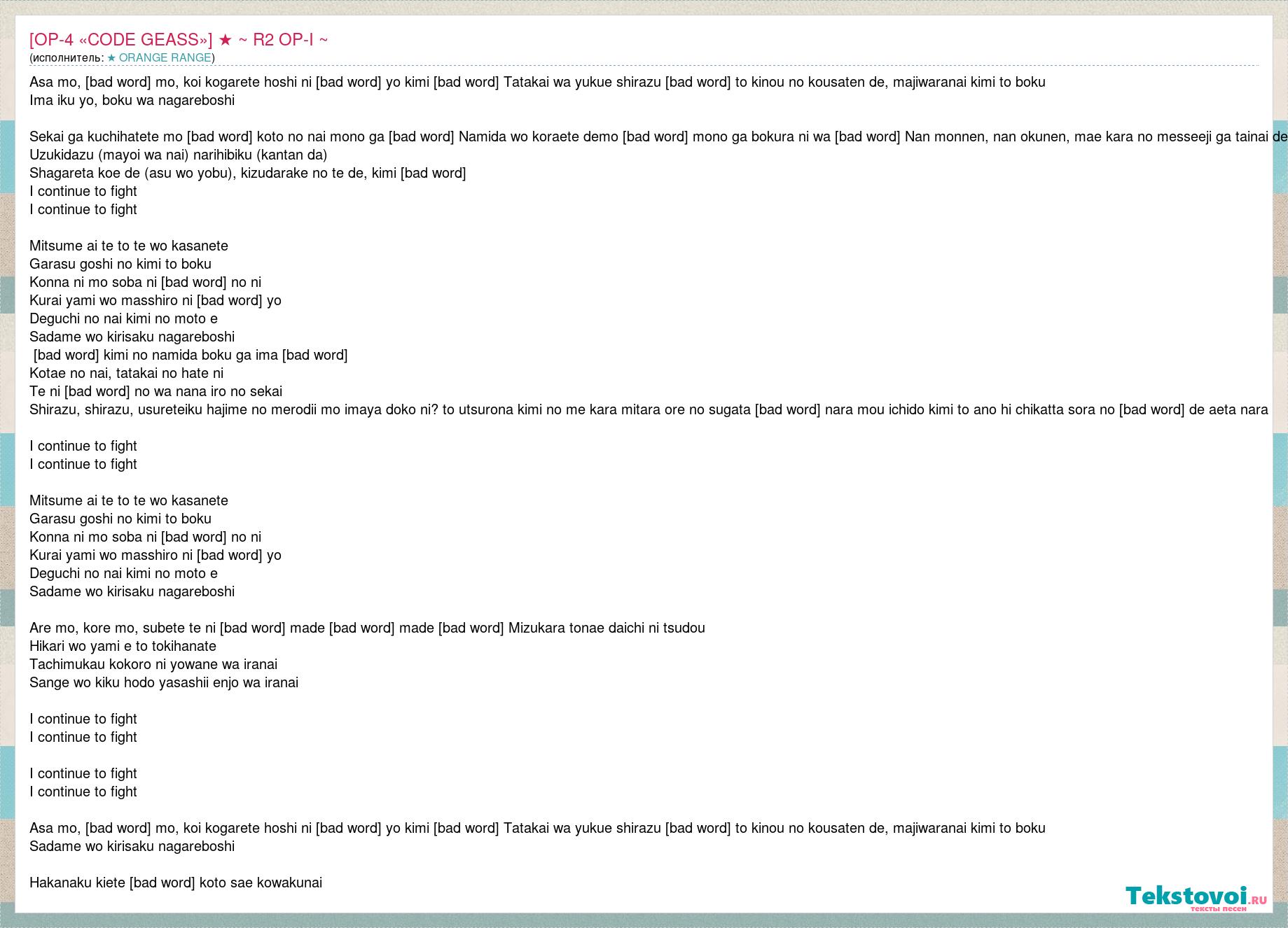 Asa mo, [bad word] mo, koi kogarete hoshi ni [bad word] yo kimi [bad word] Tatakai wa yukue shirazu [bad word] to kinou no kousaten de, majiwaranai kimi to boku Ima iku yo, boku wa nagareboshi Sekai ga kuchihatete mo [bad word] koto no nai mono ga [bad word] Namida wo koraete demo [bad word] mono ga bokura ni wa [bad word] Nan monnen, nan okunen, mae kara no messeeji ga tainai de Uzukidazu (mayoi wa nai) narihibiku (kantan da) Shagareta koe de (asu wo yobu), kizudarake no te de, kimi [bad word] I continue to fight I continue to fight Mitsume ai te to te wo kasanete Garasu goshi no kimi to boku Konna ni mo soba ni [bad word] no ni Kurai yami wo masshiro ni [bad word] yo Deguchi no nai kimi no moto e Sadame wo kirisaku nagareboshi [bad word] kimi no namida boku ga ima [bad word] Kotae no nai, tatakai no hate ni Te ni [bad word] no wa nana iro no sekai Shirazu, shirazu, usureteiku hajime no merodii mo imaya doko ni? to utsurona kimi no me kara mitara ore no sugata [bad word] nara mou ichido kimi to ano hi chikatta sora no [bad word] de aeta nara I continue to fight I continue to fight Mitsume ai te to te wo kasanete Garasu goshi no kimi to boku Konna ni mo soba ni [bad word] no ni Kurai yami wo masshiro ni [bad word] yo Deguchi no nai kimi no moto e Sadame wo kirisaku nagareboshi Are mo, kore mo, subete te ni [bad word] made [bad word] made [bad word] Mizukara tonae daichi ni tsudou Hikari wo yami e to tokihanate Tachimukau kokoro ni yowane wa iranai Sange wo kiku hodo yasashii enjo wa iranai I continue to fight I continue to fight I continue to fight I continue to fight Asa mo, [bad word] mo, koi kogarete hoshi ni [bad word] yo kimi [bad word] Tatakai wa yukue shirazu [bad word] to kinou no kousaten de, majiwaranai kimi to boku Sadame wo kirisaku nagareboshi Hakanaku kiete [bad word] koto sae kowakunai