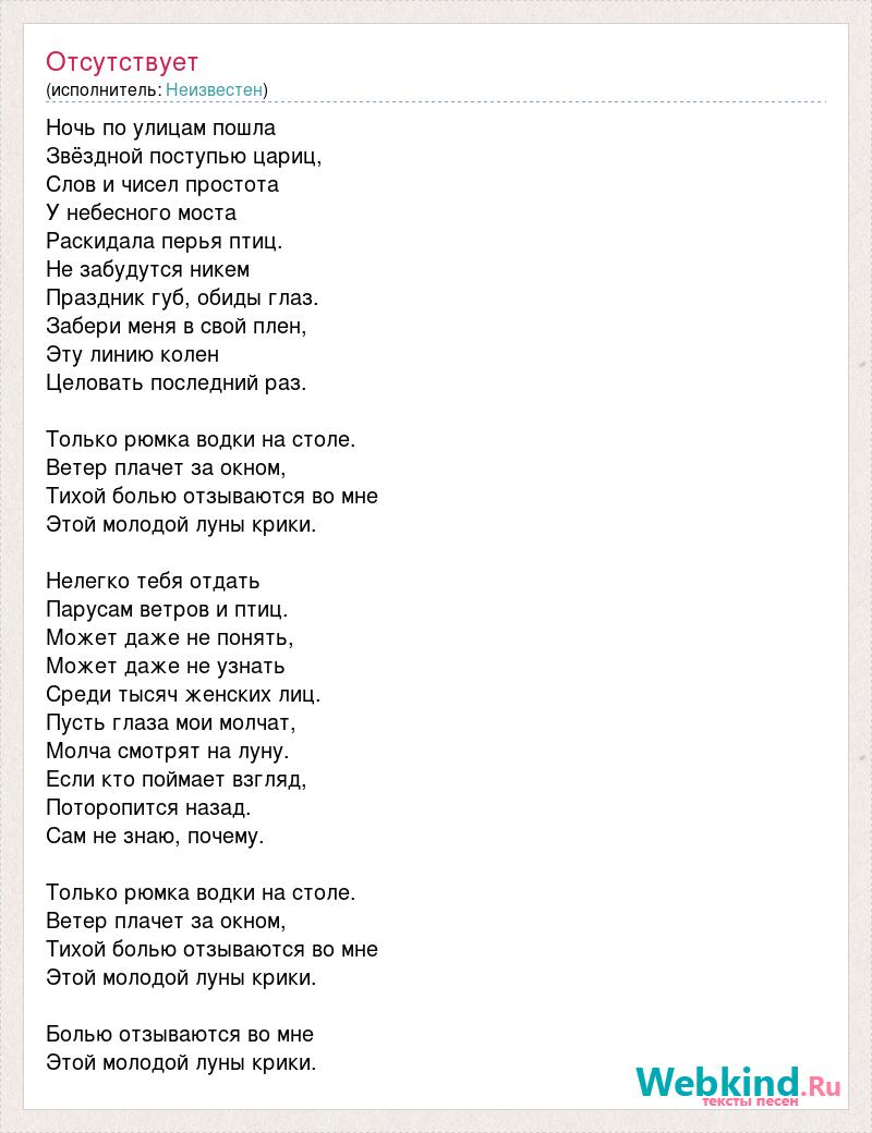 Ночь по улицам пошла Звёздной поступью цариц, Слов и чисел простота У небесного моста Раскидала перья птиц. Не забудутся никем Праздник губ, обиды глаз. Забери меня в свой плен, Эту линию колен Целовать последний раз. Только рюмка водки на столе. Ветер плачет за окном, Тихой болью отзываются во мне Этой молодой луны крики. Нелегко тебя отдать Парусам ветров и птиц. Может даже не понять, Может даже не узнать Среди тысяч женских лиц. Пусть глаза мои молчат, Молча смотрят на луну. Если кто поймает взгляд, Поторопится назад. Сам не знаю, почему. Только рюмка водки на столе. Ветер плачет за окном, Тихой болью отзываются во мне Этой молодой луны крики. Болью отзываются во мне Этой молодой луны крики.