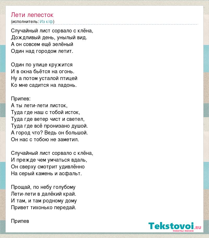 Случайный лист сорвало с клёна, Дождливый день, унылый вид. А он совсем ещё зелёный Один над городом летит. Один по улице кружится И в окна бьётся на огонь. Ну а потом усталой птицей Ко мне садится на ладонь. Припев: А ты лети-лети листок, Туда где наш с тобой исток, Туда где ветер чист и светел, Туда где всё пронизано душой. А город что? Ведь он большой. Он нас с тобою не заметил. Случайный лист сорвало с клёна, И прежде чем умчаться вдаль, Он сверху смотрит удивлённо На серый камень и асфальт. Прощай, по небу голубому Лети-лети в далёкий край. И там, и там родному дому Привет тихонько передай. Припев