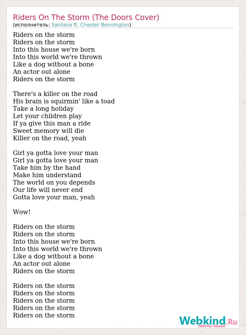 Riders on the storm Riders on the storm Into this house we're born Into this world we're thrown Like a dog without a bone An actor out alone Riders on the storm There's a killer on the road His brain is squirmin' like a toad Take a long holiday Let your children play If ya give this man a ride Sweet memory will die Killer on the road, yeah Girl ya gotta love your man Girl ya gotta love your man Take him by the hand Make him understand The world on you depends Our life will never end Gotta love your man, yeah Wow! Riders on the storm Riders on the storm Into this house we're born Into this world we're thrown Like a dog without a bone An actor out alone Riders on the storm Riders on the storm Riders on the storm Riders on the storm Riders on the storm Riders on the storm