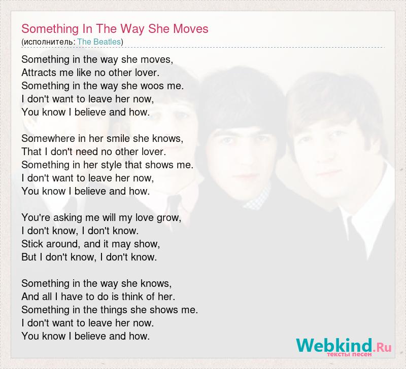 Something in the way she moves, Attracts me like no other lover. Something in the way she woos me. I don't want to leave her now, You know I believe and how. Somewhere in her smile she knows, That I don't need no other lover. Something in her style that shows me. I don't want to leave her now, You know I believe and how. You're asking me will my love grow, I don't know, I don't know. Stick around, and it may show, But I don't know, I don't know. Something in the way she knows, And all I have to do is think of her. Something in the things she shows me. I don't want to leave her now. You know I believe and how.