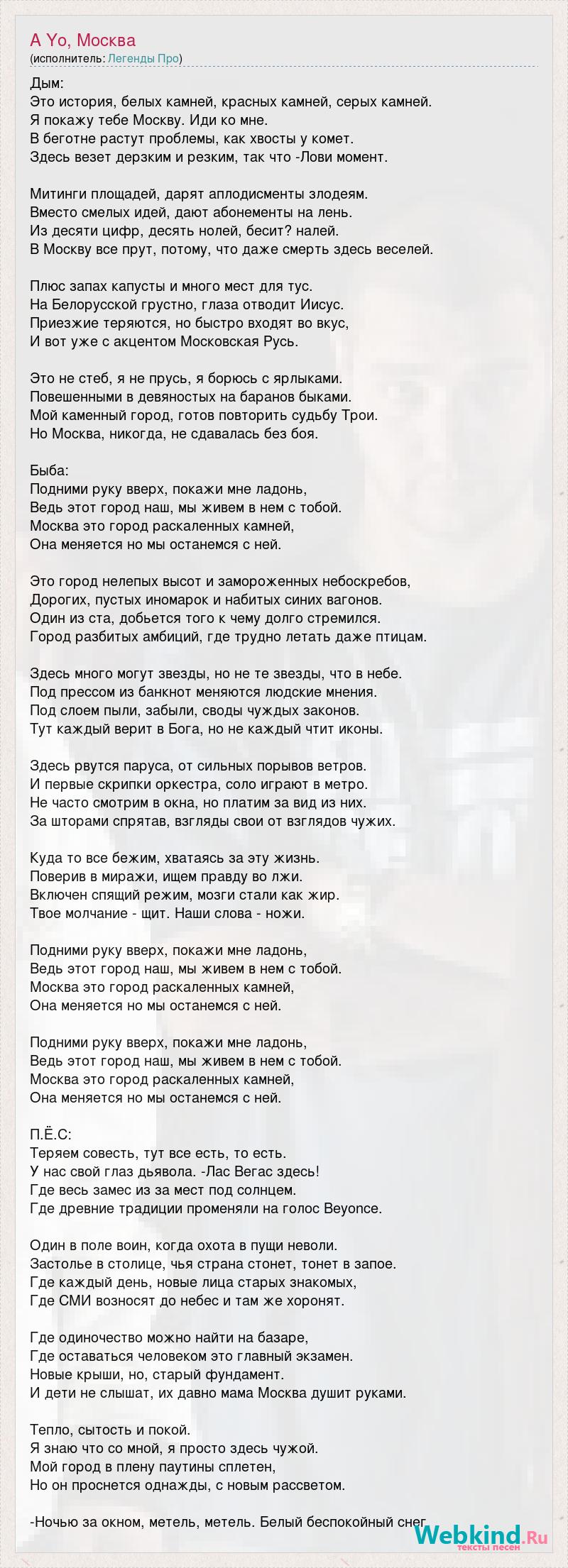 Дым: Это история, белых камней, красных камней, серых камней. Я покажу тебе Москву. Иди ко мне. В беготне растут проблемы, как хвосты у комет. Здесь везет дерзким и резким, так что -Лови момент. Митинги площадей, дарят аплодисменты злодеям. Вместо смелых идей, дают абонементы на лень. Из десяти цифр, десять нолей, бесит? налей. В Москву все прут, потому, что даже смерть здесь веселей. Плюс запах капусты и много мест для тус. На Белорусской грустно, глаза отводит Иисус. Приезжие теряются, но быстро входят во вкус, И вот уже с акцентом Московская Русь. Это не стеб, я не прусь, я борюсь с ярлыками. Повешенными в девяностых на баранов быками. Мой каменный город, готов повторить судьбу Трои. Но Москва, никогда, не сдавалась без боя. Быба: Подними руку вверх, покажи мне ладонь, Ведь этот город наш, мы живем в нем с тобой. Москва это город раскаленных камней, Она меняется но мы останемся с ней. Это город нелепых высот и замороженных небоскребов, Дорогих, пустых иномарок и набитых синих вагонов. Один из ста, добьется того к чему долго стремился. Город разбитых амбиций, где трудно летать даже птицам. Здесь много могут звезды, но не те звезды, что в небе. Под прессом из банкнот меняются людские мнения. Под слоем пыли, забыли, своды чуждых законов. Тут каждый верит в Бога, но не каждый чтит иконы. Здесь рвутся паруса, от сильных порывов ветров. И первые скрипки оркестра, соло играют в метро. Не часто смотрим в окна, но платим за вид из них. За шторами спрятав, взгляды свои от взглядов чужих. Куда то все бежим, хватаясь за эту жизнь. Поверив в миражи, ищем правду во лжи. Включен спящий режим, мозги стали как жир. Твое молчание - щит. Наши слова - ножи. Подними руку вверх, покажи мне ладонь, Ведь этот город наш, мы живем в нем с тобой. Москва это город раскаленных камней, Она меняется но мы останемся с ней. Подними руку вверх, покажи мне ладонь, Ведь этот город наш, мы живем в нем с тобой. Москва это город раскаленных камней, Она меняется но мы останемся с ней. П.Ё.С: Теряем совесть, тут все есть, то есть. У нас свой глаз дьявола. -Лас Вегас здесь! Где весь замес из за мест под солнцем. Где древние традиции променяли на голос Beyonce. Один в поле воин, когда охота в пущи неволи. Застолье в столице, чья страна стонет, тонет в запое. Где каждый день, новые лица старых знакомых, Где СМИ возносят до небес и там же хоронят. Где одиночество можно найти на базаре, Где оставаться человеком это главный экзамен. Новые крыши, но, старый фундамент. И дети не слышат, их давно мама Москва душит руками. Тепло, сытость и покой. Я знаю что со мной, я просто здесь чужой. Мой город в плену паутины сплетен, Но он проснется однажды, с новым рассветом. -Ночью за окном, метель, метель. Белый беспокойный снег.