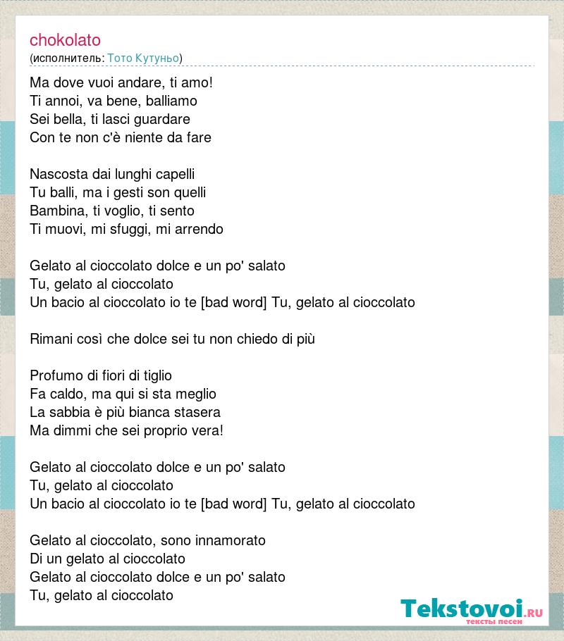 Ma dove vuoi andare, ti amo! Ti annoi, va bene, balliamo Sei bella, ti lasci guardare Con te non c'è niente da fare Nascosta dai lunghi capelli Tu balli, ma i gesti son quelli Bambina, ti voglio, ti sento Ti muovi, mi sfuggi, mi arrendo Gelato al cioccolato dolce e un po' salato Tu, gelato al cioccolato Un bacio al cioccolato io te l'ho rubato Tu, gelato al cioccolato Rimani così che dolce sei tu non chiedo di più Profumo di fiori di tiglio Fa caldo, ma qui si sta meglio La sabbia è più bianca stasera Ma dimmi che sei proprio vera! Gelato al cioccolato dolce e un po' salato Tu, gelato al cioccolato Un bacio al cioccolato io te l'ho rubato Tu, gelato al cioccolato Gelato al cioccolato, sono innamorato Di un gelato al cioccolato Gelato al cioccolato dolce e un po' salato Tu, gelato al cioccolato