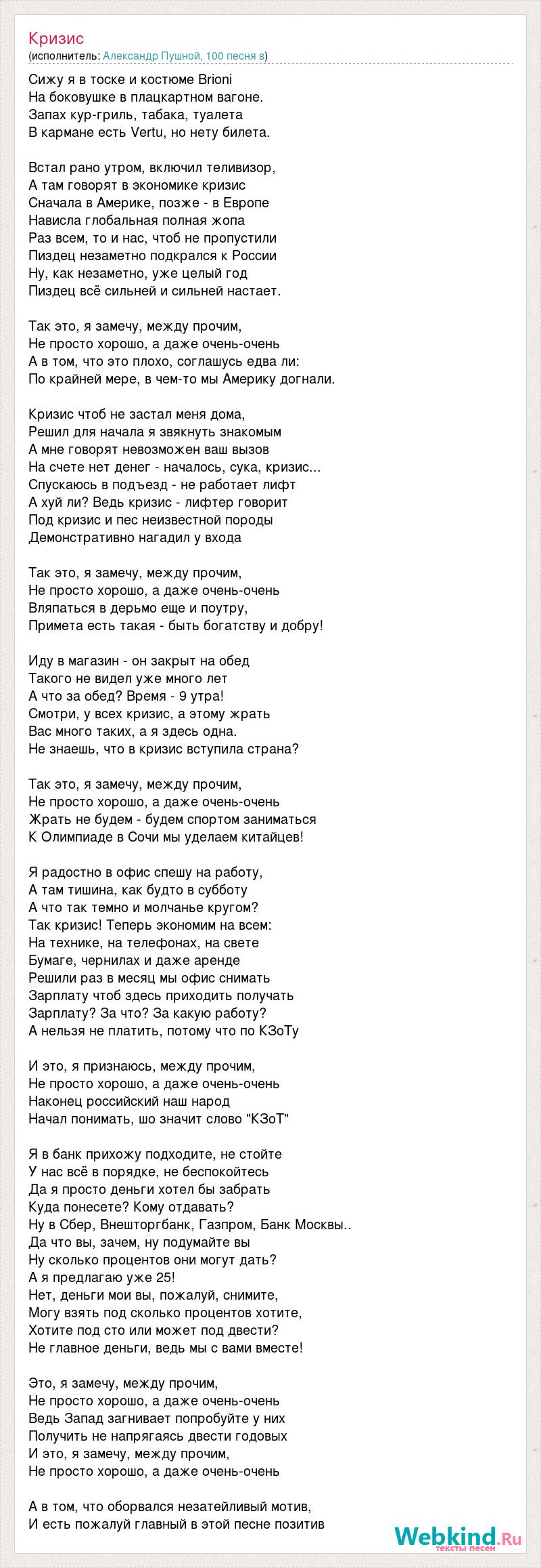 Сижу я в тоске и костюме Brioni На боковушке в плацкартном вагоне. Запах кур-гриль, табака, туалета В кармане есть Vertu, но нету билета. Встал рано утром, включил теливизор, А там говорят в экономике кризис Сначала в Америке, позже - в Европе Нависла глобальная полная жопа Раз всем, то и нас, чтоб не пропустили Пиздец незаметно подкрался к России Ну, как незаметно, уже целый год Пиздец всё сильней и сильней настает. Так это, я замечу, между прочим, Не просто хорошо, а даже очень-очень А в том, что это плохо, соглашусь едва ли: По крайней мере, в чем-то мы Америку догнали. Кризис чтоб не застал меня дома, Решил для начала я звякнуть знакомым А мне говорят невозможен ваш вызов На счете нет денег - началось, сука, кризис... Спускаюсь в подъезд - не работает лифт А хуй ли? Ведь кризис - лифтер говорит Под кризис и пес неизвестной породы Демонстративно нагадил у входа Так это, я замечу, между прочим, Не просто хорошо, а даже очень-очень Вляпаться в дерьмо еще и поутру, Примета есть такая - быть богатству и добру! Иду в магазин - он закрыт на обед Такого не видел уже много лет А что за обед? Время - 9 утра! Смотри, у всех кризис, а этому жрать Вас много таких, а я здесь одна. Не знаешь, что в кризис вступила страна? Так это, я замечу, между прочим, Не просто хорошо, а даже очень-очень Жрать не будем - будем спортом заниматься К Олимпиаде в Сочи мы уделаем китайцев! Я радостно в офис спешу на работу, А там тишина, как будто в субботу А что так темно и молчанье кругом? Так кризис! Теперь экономим на всем: На технике, на телефонах, на свете Бумаге, чернилах и даже аренде Решили раз в месяц мы офис снимать Зарплату чтоб здесь приходить получать Зарплату? За что? За какую работу? А нельзя не платить, потому что по КЗоТу И это, я признаюсь, между прочим, Не просто хорошо, а даже очень-очень Наконец российский наш народ Начал понимать, шо значит слово "КЗоТ" Я в банк прихожу подходите, не стойте У нас всё в порядке, не беспокойтесь Да я просто деньги хотел бы забрать Куда понесете? Кому отдавать? Ну в Сбер, Внешторгбанк, Газпром, Банк Москвы.. Да что вы, зачем, ну подумайте вы Ну сколько процентов они могут дать? А я предлагаю уже 25! Нет, деньги мои вы, пожалуй, снимите, Могу взять под сколько процентов хотите, Хотите под сто или может под двести? Не главное деньги, ведь мы с вами вместе! Это, я замечу, между прочим, Не просто хорошо, а даже очень-очень Ведь Запад загнивает попробуйте у них Получить не напрягаясь двести годовых И это, я замечу, между прочим, Не просто хорошо, а даже очень-очень А в том, что оборвался незатейливый мотив, И есть пожалуй главный в этой песне позитив