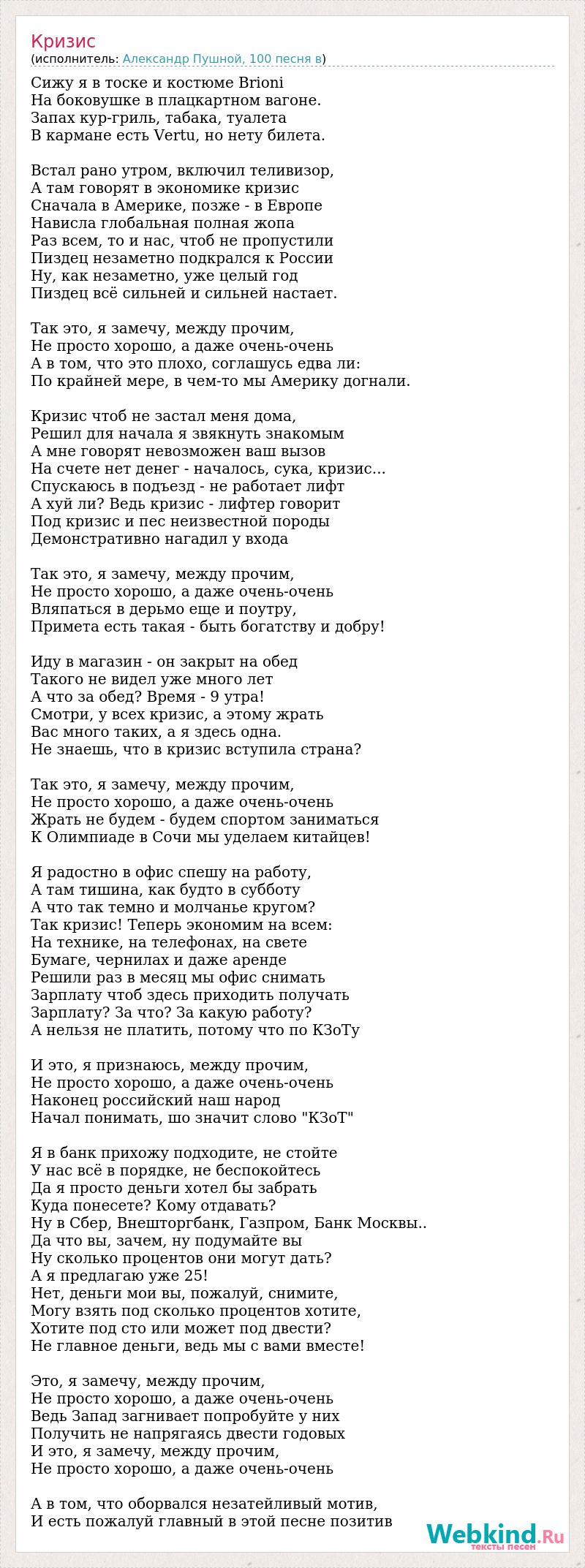 Сижу я в тоске и костюме Brioni На боковушке в плацкартном вагоне. Запах кур-гриль, табака, туалета В кармане есть Vertu, но нету билета. Встал рано утром, включил теливизор, А там говорят в экономике кризис Сначала в Америке, позже - в Европе Нависла глобальная полная жопа Раз всем, то и нас, чтоб не пропустили Пиздец незаметно подкрался к России Ну, как незаметно, уже целый год Пиздец всё сильней и сильней настает. Так это, я замечу, между прочим, Не просто хорошо, а даже очень-очень А в том, что это плохо, соглашусь едва ли: По крайней мере, в чем-то мы Америку догнали. Кризис чтоб не застал меня дома, Решил для начала я звякнуть знакомым А мне говорят невозможен ваш вызов На счете нет денег - началось, сука, кризис... Спускаюсь в подъезд - не работает лифт А хуй ли? Ведь кризис - лифтер говорит Под кризис и пес неизвестной породы Демонстративно нагадил у входа Так это, я замечу, между прочим, Не просто хорошо, а даже очень-очень Вляпаться в дерьмо еще и поутру, Примета есть такая - быть богатству и добру! Иду в магазин - он закрыт на обед Такого не видел уже много лет А что за обед? Время - 9 утра! Смотри, у всех кризис, а этому жрать Вас много таких, а я здесь одна. Не знаешь, что в кризис вступила страна? Так это, я замечу, между прочим, Не просто хорошо, а даже очень-очень Жрать не будем - будем спортом заниматься К Олимпиаде в Сочи мы уделаем китайцев! Я радостно в офис спешу на работу, А там тишина, как будто в субботу А что так темно и молчанье кругом? Так кризис! Теперь экономим на всем: На технике, на телефонах, на свете Бумаге, чернилах и даже аренде Решили раз в месяц мы офис снимать Зарплату чтоб здесь приходить получать Зарплату? За что? За какую работу? А нельзя не платить, потому что по КЗоТу И это, я признаюсь, между прочим, Не просто хорошо, а даже очень-очень Наконец российский наш народ Начал понимать, шо значит слово "КЗоТ" Я в банк прихожу подходите, не стойте У нас всё в порядке, не беспокойтесь Да я просто деньги хотел бы забрать Куда понесете? Кому отдавать? Ну в Сбер, Внешторгбанк, Газпром, Банк Москвы.. Да что вы, зачем, ну подумайте вы Ну сколько процентов они могут дать? А я предлагаю уже 25! Нет, деньги мои вы, пожалуй, снимите, Могу взять под сколько процентов хотите, Хотите под сто или может под двести? Не главное деньги, ведь мы с вами вместе! Это, я замечу, между прочим, Не просто хорошо, а даже очень-очень Ведь Запад загнивает попробуйте у них Получить не напрягаясь двести годовых И это, я замечу, между прочим, Не просто хорошо, а даже очень-очень А в том, что оборвался незатейливый мотив, И есть пожалуй главный в этой песне позитив