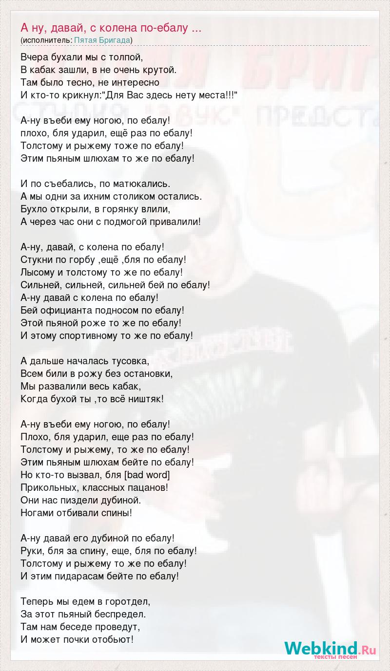 Вчера бухали мы с толпой, В кабак зашли, в не очень крутой. Там было тесно, не интересно И кто-то крикнул:"Для Вас здесь нету места!!!" А-ну въеби ему ногою, по ебалу! плохо, бля ударил, ещё раз по ебалу! Толстому и рыжему тоже по ебалу! Этим пьяным шлюхам то же по ебалу! И по съебались, по матюкались. А мы одни за ихним столиком остались. Бухло открыли, в горянку влили, А через час они с подмогой привалили! А-ну, давай, с колена по ебалу! Стукни по горбу ,ещё ,бля по ебалу! Лысому и толстому то же по ебалу! Сильней, сильней, сильней бей по ебалу! А-ну давай с колена по ебалу! Бей официанта подносом по ебалу! Этой пьяной роже то же по ебалу! И этому спортивному то же по ебалу! А дальше началась тусовка, Всем били в рожу без остановки, Мы развалили весь кабак, Когда бухой ты ,то всё ништяк! А-ну въеби ему ногою, по ебалу! Плохо, бля ударил, еще раз по ебалу! Толстому и рыжему, то же по ебалу! Этим пьяным шлюхам бейте по ебалу! Но кто-то вызвал, бля [bad word] Прикольных, классных пацанов! Они нас пиздели дубиной. Ногами отбивали спины! А-ну давай его дубиной по ебалу! Руки, бля за спину, еще, бля по ебалу! Толстому и рыжему то же по ебалу! И этим пидарасам бейте по ебалу! Теперь мы едем в горотдел, За этот пьяный беспредел. Там нам беседе проведут, И может почки отобьют!