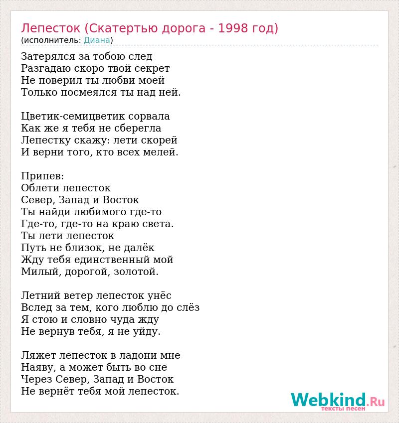 Затерялся за тобою след Разгадаю скоро твой секрет Не поверил ты любви моей Только посмеялся ты над ней. Цветик-семицветик сорвала Как же я тебя не сберегла Лепестку скажу: лети скорей И верни того, кто всех мелей. Припев: Облети лепесток Север, Запад и Восток Ты найди любимого где-то Где-то, где-то на краю света. Ты лети лепесток Путь не близок, не далёк Жду тебя единственный мой Милый, дорогой, золотой. Летний ветер лепесток унёс Вслед за тем, кого люблю до слёз Я стою и словно чуда жду Не вернув тебя, я не уйду. Ляжет лепесток в ладони мне Наяву, а может быть во сне Через Север, Запад и Восток Не вернёт тебя мой лепесток.