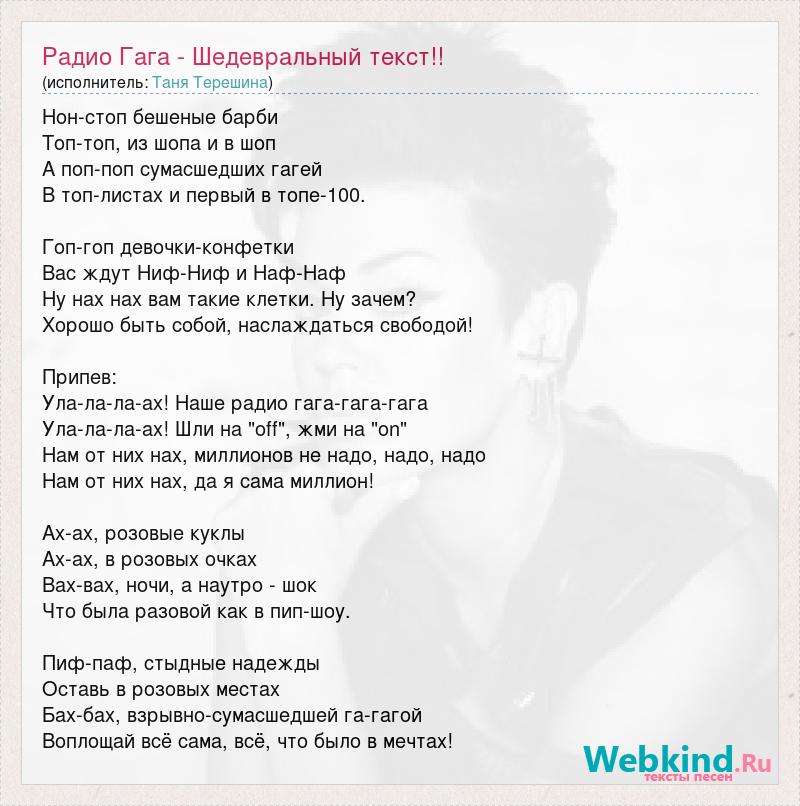 Нон-стоп бешеные барби Топ-топ, из шопа и в шоп А поп-поп сумасшедших гагей В топ-листах и первый в топе-100. Гоп-гоп девочки-конфетки Вас ждут Ниф-Ниф и Наф-Наф Ну нах нах вам такие клетки. Ну зачем? Хорошо быть собой, наслаждаться свободой! Припев: Ула-ла-ла-ах! Наше радио гага-гага-гага Ула-ла-ла-ах! Шли на "off", жми на "on" Нам от них нах, миллионов не надо, надо, надо Нам от них нах, да я сама миллион! Ах-ах, розовые куклы Ах-ах, в розовых очках Вах-вах, ночи, а наутро - шок Что была разовой как в пип-шоу. Пиф-паф, стыдные надежды Оставь в розовых местах Бах-бах, взрывно-сумасшедшей га-гагой Воплощай всё сама, всё, что было в мечтах!