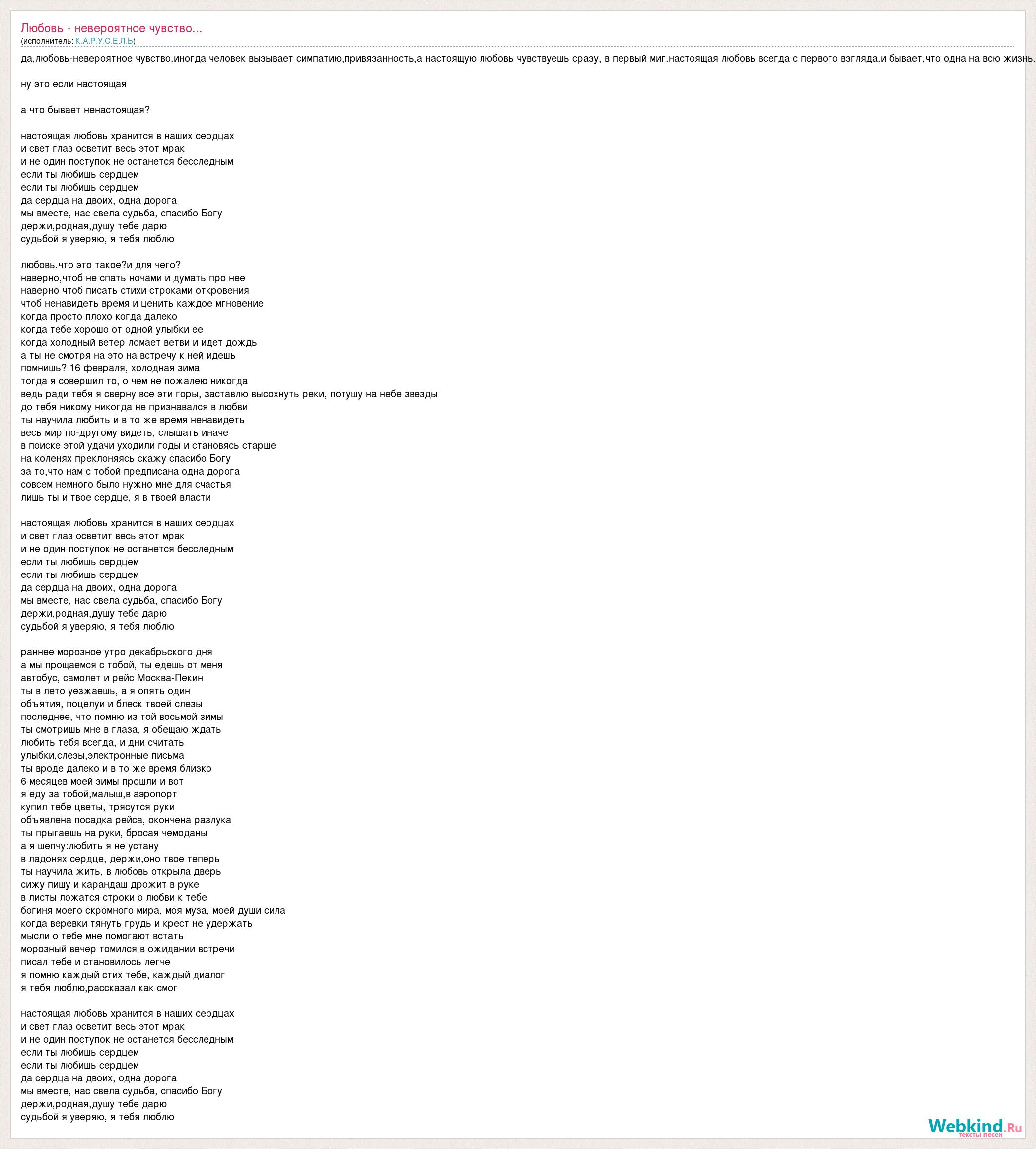 да,любовь-невероятное чувство.иногда человек вызывает симпатию,привязанность,а настоящую любовь чувствуешь сразу, в первый миг.настоящая любовь всегда с первого взгляда.и бывает,что одна на всю жизнь. ну это если настоящая а что бывает ненастоящая? настоящая любовь хранится в наших сердцах и свет глаз осветит весь этот мрак и не один поступок не останется бесследным если ты любишь сердцем если ты любишь сердцем да сердца на двоих, одна дорога мы вместе, нас свела судьба, спасибо Богу держи,родная,душу тебе дарю судьбой я уверяю, я тебя люблю любовь.что это такое?и для чего? наверно,чтоб не спать ночами и думать про нее наверно чтоб писать стихи строками откровения чтоб ненавидеть время и ценить каждое мгновение когда просто плохо когда далеко когда тебе хорошо от одной улыбки ее когда холодный ветер ломает ветви и идет дождь а ты не смотря на это на встречу к ней идешь помнишь? 16 февраля, холодная зима тогда я совершил то, о чем не пожалею никогда ведь ради тебя я сверну все эти горы, заставлю высохнуть реки, потушу на небе звезды до тебя никому никогда не признавался в любви ты научила любить и в то же время ненавидеть весь мир по-другому видеть, слышать иначе в поиске этой удачи уходили годы и становясь старше на коленях преклоняясь скажу спасибо Богу за то,что нам с тобой предписана одна дорога совсем немного было нужно мне для счастья лишь ты и твое сердце, я в твоей власти настоящая любовь хранится в наших сердцах и свет глаз осветит весь этот мрак и не один поступок не останется бесследным если ты любишь сердцем если ты любишь сердцем да сердца на двоих, одна дорога мы вместе, нас свела судьба, спасибо Богу держи,родная,душу тебе дарю судьбой я уверяю, я тебя люблю раннее морозное утро декабрьского дня а мы прощаемся с тобой, ты едешь от меня автобус, самолет и рейс Москва-Пекин ты в лето уезжаешь, а я опять один объятия, поцелуи и блеск твоей слезы последнее, что помню из той восьмой зимы ты смотришь мне в глаза, я обещаю ждать любить тебя всегда, и дни считать улыбки,слезы,электронные письма ты вроде далеко и в то же время близко 6 месяцев моей зимы прошли и вот я еду за тобой,малыш,в аэропорт купил тебе цветы, трясутся руки объявлена посадка рейса, окончена разлука ты прыгаешь на руки, бросая чемоданы а я шепчу:любить я не устану в ладонях сердце, держи,оно твое теперь ты научила жить, в любовь открыла дверь сижу пишу и карандаш дрожит в руке в листы ложатся строки о любви к тебе богиня моего скромного мира, моя муза, моей души сила когда веревки тянуть грудь и крест не удержать мысли о тебе мне помогают встать морозный вечер томился в ожидании встречи писал тебе и становилось легче я помню каждый стих тебе, каждый диалог я тебя люблю,рассказал как смог настоящая любовь хранится в наших сердцах и свет глаз осветит весь этот мрак и не один поступок не останется бесследным если ты любишь сердцем если ты любишь сердцем да сердца на двоих, одна дорога мы вместе, нас свела судьба, спасибо Богу держи,родная,душу тебе дарю судьбой я уверяю, я тебя люблю