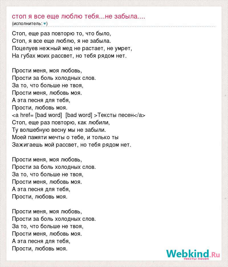 Стоп, еще раз повторю то, что было, Стоп, я все еще люблю, я не забыла. Поцелуев нежный мед не растает, не умрет, На губах моих рассвет, но тебя рядом нет. Прости меня, моя любовь, Прости за боль холодных слов. За то, что больше не твоя, Прости меня, любовь моя. А эта песня для тебя, Прости, любовь моя. <a href= [bad word] [bad word] >Тексты песен</a> Стоп, еще раз повторю, как любили, Ту волшебную весну мы не забыли. Моей памяти мечты о тебе, и только ты Зажигаешь мой рассвет, но тебя рядом нет. Прости меня, моя любовь, Прости за боль холодных слов. За то, что больше не твоя, Прости меня, любовь моя. А эта песня для тебя, Прости, любовь моя. Прости меня, моя любовь, Прости за боль холодных слов. За то, что больше не твоя, Прости меня, любовь моя. А эта песня для тебя, Прости, любовь моя.