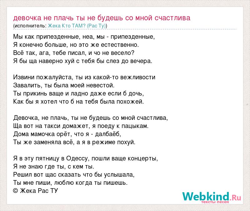 Мы как припезденные, неа, мы - припезденные, Я конечно больше, но это же естественно. Всё так, ага, тебе писал, и чо не весело? Я бы ща наверно хуй с тебя бы слез до вечера. Извини пожалуйста, ты из какой-то вежливости Завалить, ты была моей невестой. Ты прикинь ваще и ладно даже если б дочь, Как бы я хотел что б на тебя была похожей. Девочка, не плачь, ты не будешь со мной счастлива, Ща вот на такси домажет, я поеду к пацыкам. Дома мамочка орёт, что я - далбаёб, Ты же заменяла всё, а я в режиме похуй. Я в эту пятницу в Одессу, пошли ваще концерты, Я не знаю где ты, с кем ты. Решил вот щас сказать что бы услышала, Ты мне пиши, люблю когда ты пишешь. © Жека Рас ТУ