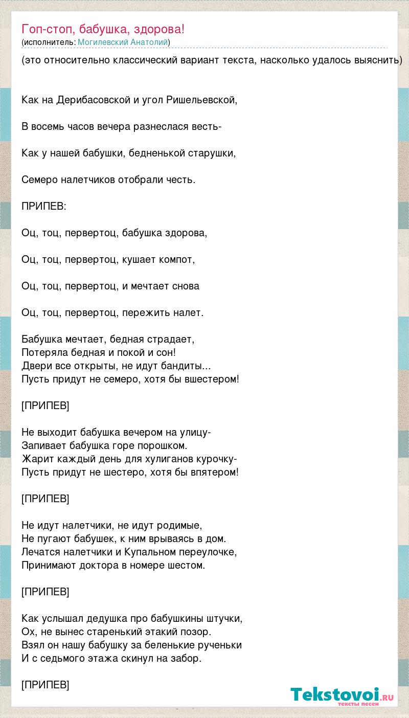(это относительно классический вариант текста, насколько удалось выяснить) Как на Дерибасовской и угол Ришельевской, В восемь часов вечера разнеслася весть- Как у нашей бабушки, бедненькой старушки, Семеро налетчиков отобрали честь. ПРИПЕВ: Оц, тоц, первертоц, бабушка здорова, Оц, тоц, первертоц, кушает компот, Оц, тоц, первертоц, и мечтает снова Оц, тоц, первертоц, пережить налет. Бабушка мечтает, бедная страдает, Потеряла бедная и покой и сон! Двери все открыты, не идут бандиты... Пусть придут не семеро, хотя бы вшестером! [ПРИПЕВ] Не выходит бабушка вечером на улицу- Запивает бабушка горе порошком. Жарит каждый день для хулиганов курочку- Пусть придут не шестеро, хотя бы впятером! [ПРИПЕВ] Не идут налетчики, не идут родимые, Не пугают бабушек, к ним врываясь в дом. Лечатся налетчики и Купальном переулочке, Принимают доктора в номере шестом. [ПРИПЕВ] Как услышал дедушка про бабушкины штучки, Ох, не вынес старенький этакий позор. Взял он нашу бабушку за беленькие рученьки И с седьмого этажа скинул на забор. [ПРИПЕВ]