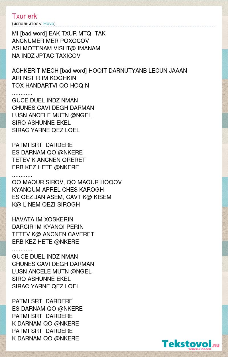 MI SIRUN EAK TXUR MTQI TAK ANCNUMER MER POXOCOV ASI MOTENAM VISHT@ IMANAM NA INDZ JPTAC TAXICOV ACHKERIT MECH TXRUTYUN HOQIT DARNUTYANB LECUN JAAAN ARI NSTIR IM KOGHKIN TOX HANDARTVI QO HOQIN ............ GUCE DUEL INDZ NMAN CHUNES CAVI DEGH DARMAN LUSN ANCELE MUTN @NGEL SIRO ASHUNNE EKEL SIRAC YARNE QEZ LQEL PATMI SRTI DARDERE ES DARNAM QO @NKERE TETEV K ANCNEN ORERET ERB KEZ HETE @NKERE ............ QO MAQUR SIROV, QO MAQUR HOQOV KYANQUM APREL CHES KAROGH ES QEZ JAN ASEM, CAVT K@ KISEM K@ LINEM QEZI SIROGH HAVATA IM XOSKERIN DARCIR IM KYANQI PERIN TETEV K@ ANCNEN CAVERET ERB KEZ HETE @NKERE ............ GUCE DUEL INDZ NMAN CHUNES CAVI DEGH DARMAN LUSN ANCELE MUTN @NGEL SIRO ASHUNNE EKEL SIRAC YARNE QEZ LQEL PATMI SRTI DARDERE ES DARNAM QO @NKERE PATMI SRTI DARDERE K DARNAM QO @NKERE PATMI SRTI DARDERE K DARNAM QO @NKERE