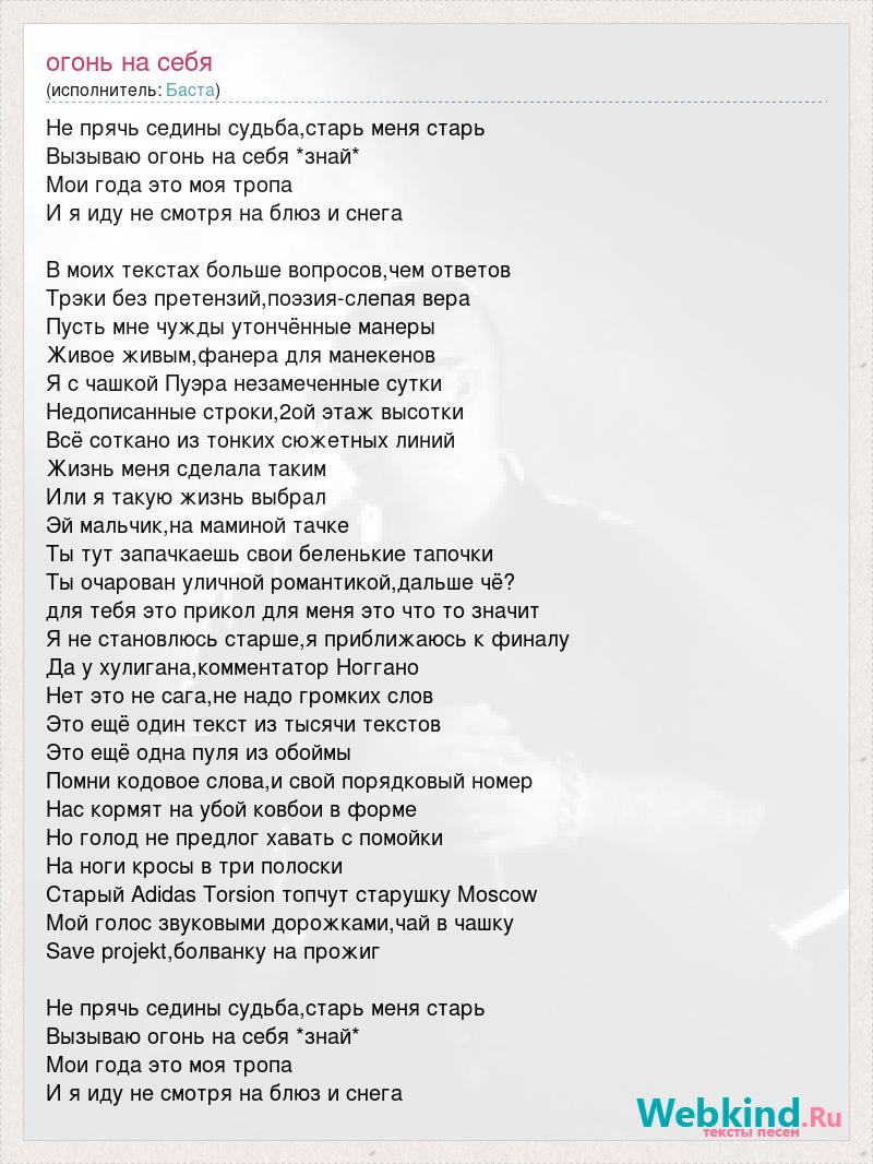 Не прячь седины судьба,старь меня старь Вызываю огонь на себя *знай* Мои года это моя тропа И я иду не смотря на блюз и снега В моих текстах больше вопросов,чем ответов Трэки без претензий,поэзия-слепая вера Пусть мне чужды утончённые манеры Живое живым,фанера для манекенов Я с чашкой Пуэра незамеченные сутки Недописанные строки,2ой этаж высотки Всё соткано из тонких сюжетных линий Жизнь меня сделала таким Или я такую жизнь выбрал Эй мальчик,на маминой тачке Ты тут запачкаешь свои беленькие тапочки Ты очарован уличной романтикой,дальше чё? для тебя это прикол для меня это что то значит Я не становлюсь старше,я приближаюсь к финалу Да у хулигана,комментатор Ноггано Нет это не сага,не надо громких слов Это ещё один текст из тысячи текстов Это ещё одна пуля из обоймы Помни кодовое слова,и свой порядковый номер Нас кормят на убой ковбои в форме Но голод не предлог хавать с помойки На ноги кросы в три полоски Старый Adidas Torsion топчут старушку Moscow Мой голос звуковыми дорожками,чай в чашку Save projekt,болванку на прожиг Не прячь седины судьба,старь меня старь Вызываю огонь на себя *знай* Мои года это моя тропа И я иду не смотря на блюз и снега
