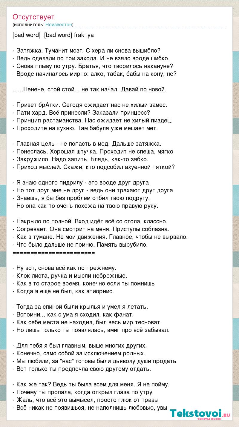 [bad word] [bad word] frak_ya - Затяжка. Туманит мозг. С хера ли снова вышибло? - Ведь сделали по три захода. И не взяло вроде шибко. - Снова плыву по утру. Братья, что творилось накануне? - Вроде начиналось мирно: алко, табак, бабы на кону, не? ......Ненене, стой стой... не так начал. Давай по новой. - Привет брАтки. Сегодя ожидает нас не хилый замес. - Пати хард. Всё принесли? Заказали принцесс? - Принцип растаманства. Нас ожидает не хилый пиздец. - Проходите на кухню. Там бабуля уже мешает мет. - Главная цель - не попасть в мед. Дальше затяжка. - Понеслась. Хорошая штучка. Проходит не спеша, мягко - Закружило. Надо запить. Блядь, как-то зябко. - Приход мыслей. Скажи, кто подсобил ахуенной пяткой? - Я знаю одного пидрилу - это вроде друг друга - Но тот друг мне не друг - ведь они трахают друг друга - Знаешь, я бы без проблем отбил твою подругу, - Но она как-то очень похожа на твою правую руку. - Накрыло по полной. Вход идёт всё со стола, классно. - Согревает. Она смотрит на меня. Приступы соблазна. - Как в тумане. Не мои движения. Главное, чтобы не вырвало. - Что было дальше не помню. Память вырубило. ======================= - Ну вот, снова всё как по прежнему. - Клок листа, ручка и мысли небрежные. - Как в то старое время, конечно если ты помнишь - Когда я ещё не был, как эпиорнис. - Тогда за спиной были крылья и умел я летать. - Вспомни... как с ума я сходил, как фанат. - Как себе места не находил, был весь мир тесноват. - Но лишь только ты появлялась, вмиг про всё забывал. - Для тебя я был главным, выше многих других. - Конечно, само собой за исключением родных. - Мы любили, за "нас" готовы были дьяволу души продать - Вот только ты предпочла свою другому отдать. - Как же так? Ведь ты была всем для меня. Я не пойму. - Почему ты пропала, когда открыл глаза по утру - Жаль, что всё это вымысел, просто глюк от травы - Всё никак не появишься, не наполнишь любовью, увы