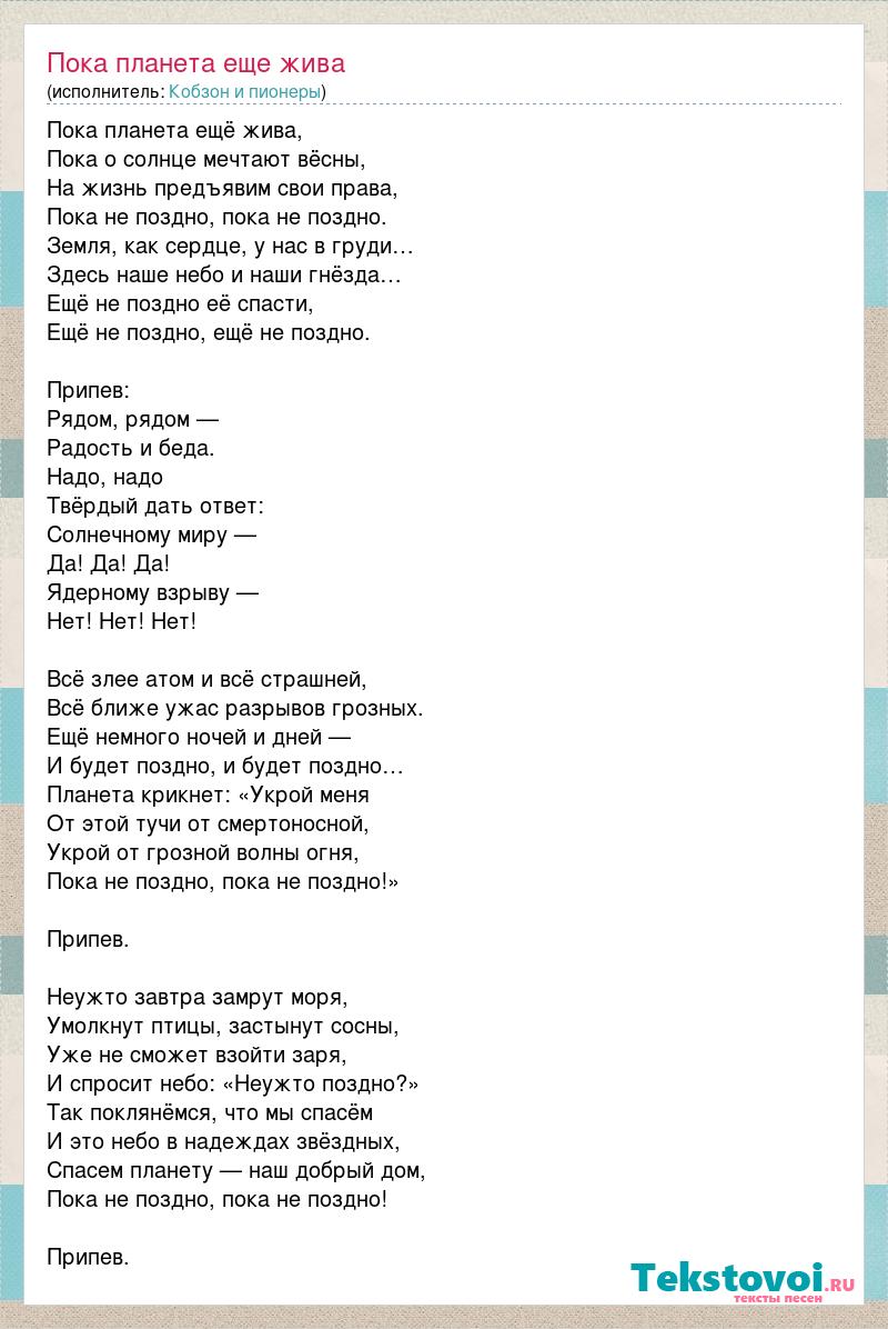Пока планета ещё жива, Пока о солнце мечтают вёсны, На жизнь предъявим свои права, Пока не поздно, пока не поздно. Земля, как сердце, у нас в груди… Здесь наше небо и наши гнёзда… Ещё не поздно её спасти, Ещё не поздно, ещё не поздно. Припев: Рядом, рядом — Радость и беда. Надо, надо Твёрдый дать ответ: Солнечному миру — Да! Да! Да! Ядерному взрыву — Нет! Нет! Нет! Всё злее атом и всё страшней, Всё ближе ужас разрывов грозных. Ещё немного ночей и дней — И будет поздно, и будет поздно… Планета крикнет: «Укрой меня От этой тучи от смертоносной, Укрой от грозной волны огня, Пока не поздно, пока не поздно!» Припев. Неужто завтра замрут моря, Умолкнут птицы, застынут сосны, Уже не сможет взойти заря, И спросит небо: «Неужто поздно?» Так поклянёмся, что мы спасём И это небо в надеждах звёздных, Спасем планету — наш добрый дом, Пока не поздно, пока не поздно! Припев.