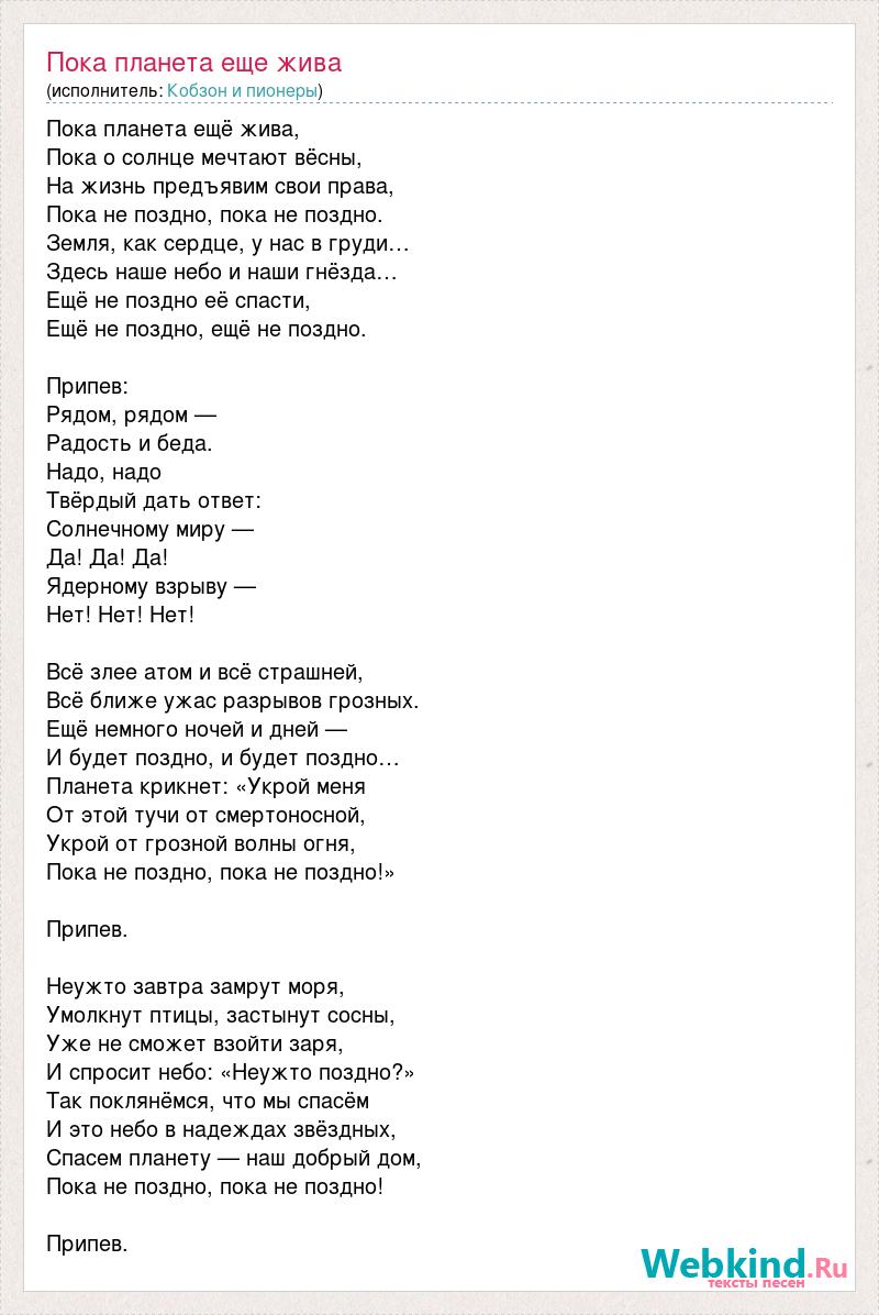 Пока планета ещё жива, Пока о солнце мечтают вёсны, На жизнь предъявим свои права, Пока не поздно, пока не поздно. Земля, как сердце, у нас в груди… Здесь наше небо и наши гнёзда… Ещё не поздно её спасти, Ещё не поздно, ещё не поздно. Припев: Рядом, рядом — Радость и беда. Надо, надо Твёрдый дать ответ: Солнечному миру — Да! Да! Да! Ядерному взрыву — Нет! Нет! Нет! Всё злее атом и всё страшней, Всё ближе ужас разрывов грозных. Ещё немного ночей и дней — И будет поздно, и будет поздно… Планета крикнет: «Укрой меня От этой тучи от смертоносной, Укрой от грозной волны огня, Пока не поздно, пока не поздно!» Припев. Неужто завтра замрут моря, Умолкнут птицы, застынут сосны, Уже не сможет взойти заря, И спросит небо: «Неужто поздно?» Так поклянёмся, что мы спасём И это небо в надеждах звёздных, Спасем планету — наш добрый дом, Пока не поздно, пока не поздно! Припев.