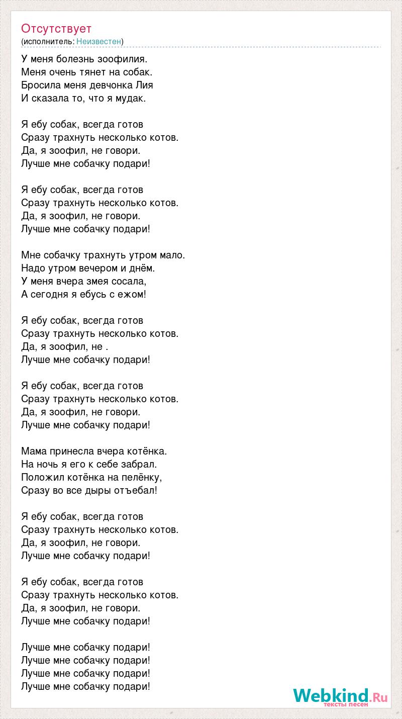 У меня болезнь зоофилия. Меня очень тянет на собак. Бросила меня девчонка Лия И сказала то, что я мудак. Я ебу собак, всегда готов Сразу трахнуть несколько котов. Да, я зоофил, не говори. Лучше мне собачку подари! Я ебу собак, всегда готов Сразу трахнуть несколько котов. Да, я зоофил, не говори. Лучше мне собачку подари! Мне собачку трахнуть утром мало. Надо утром вечером и днём. У меня вчера змея сосала, А сегодня я ебусь с ежом! Я ебу собак, всегда готов Сразу трахнуть несколько котов. Да, я зоофил, не . Лучше мне собачку подари! Я ебу собак, всегда готов Сразу трахнуть несколько котов. Да, я зоофил, не говори. Лучше мне собачку подари! Мама принесла вчера котёнка. На ночь я его к себе забрал. Положил котёнка на пелёнку, Сразу во все дыры отъебал! Я ебу собак, всегда готов Сразу трахнуть несколько котов. Да, я зоофил, не говори. Лучше мне собачку подари! Я ебу собак, всегда готов Сразу трахнуть несколько котов. Да, я зоофил, не говори. Лучше мне собачку подари! Лучше мне собачку подари! Лучше мне собачку подари! Лучше мне собачку подари! Лучше мне собачку подари!