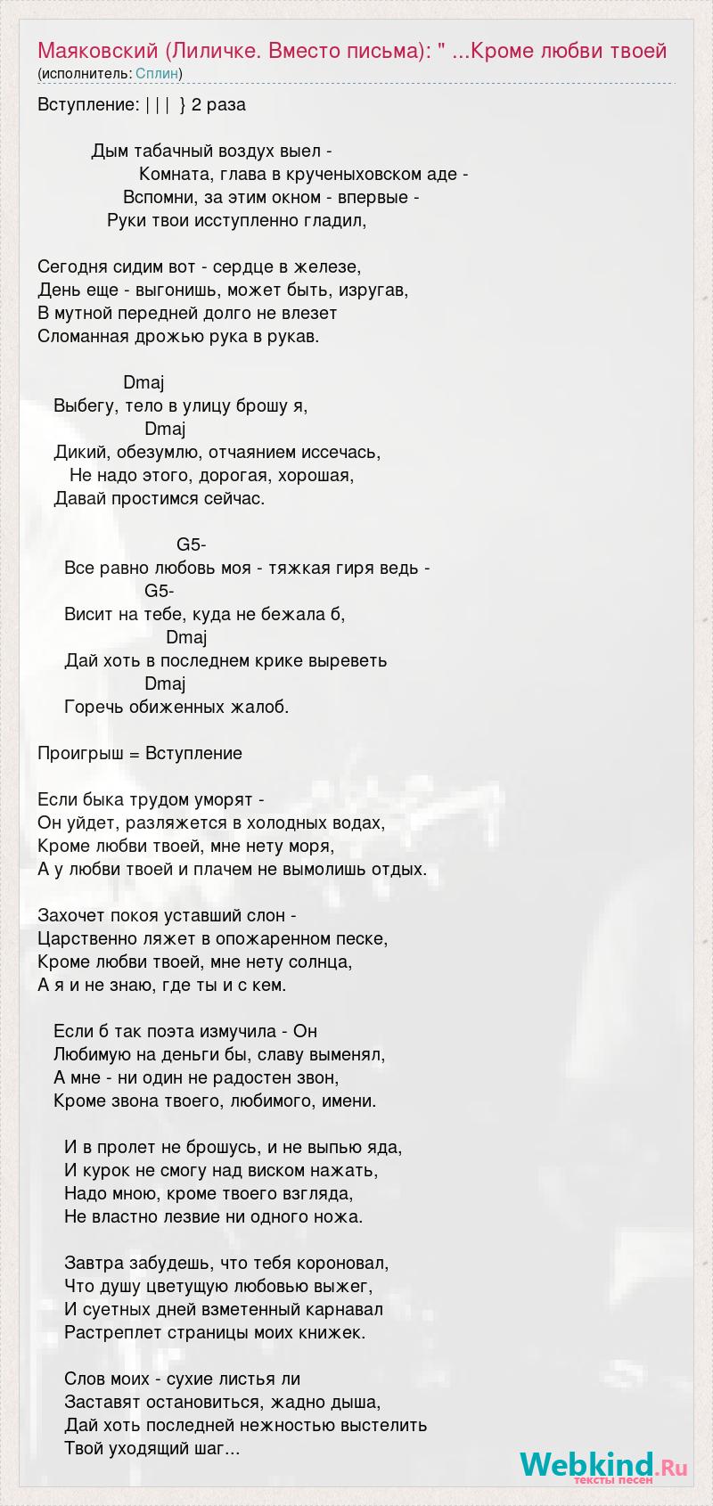 Главная→Исполнители→Сплин→Маяковский (Лиличке. Вместо письма): " ...Кроме любви твоей мне нету солнца / А