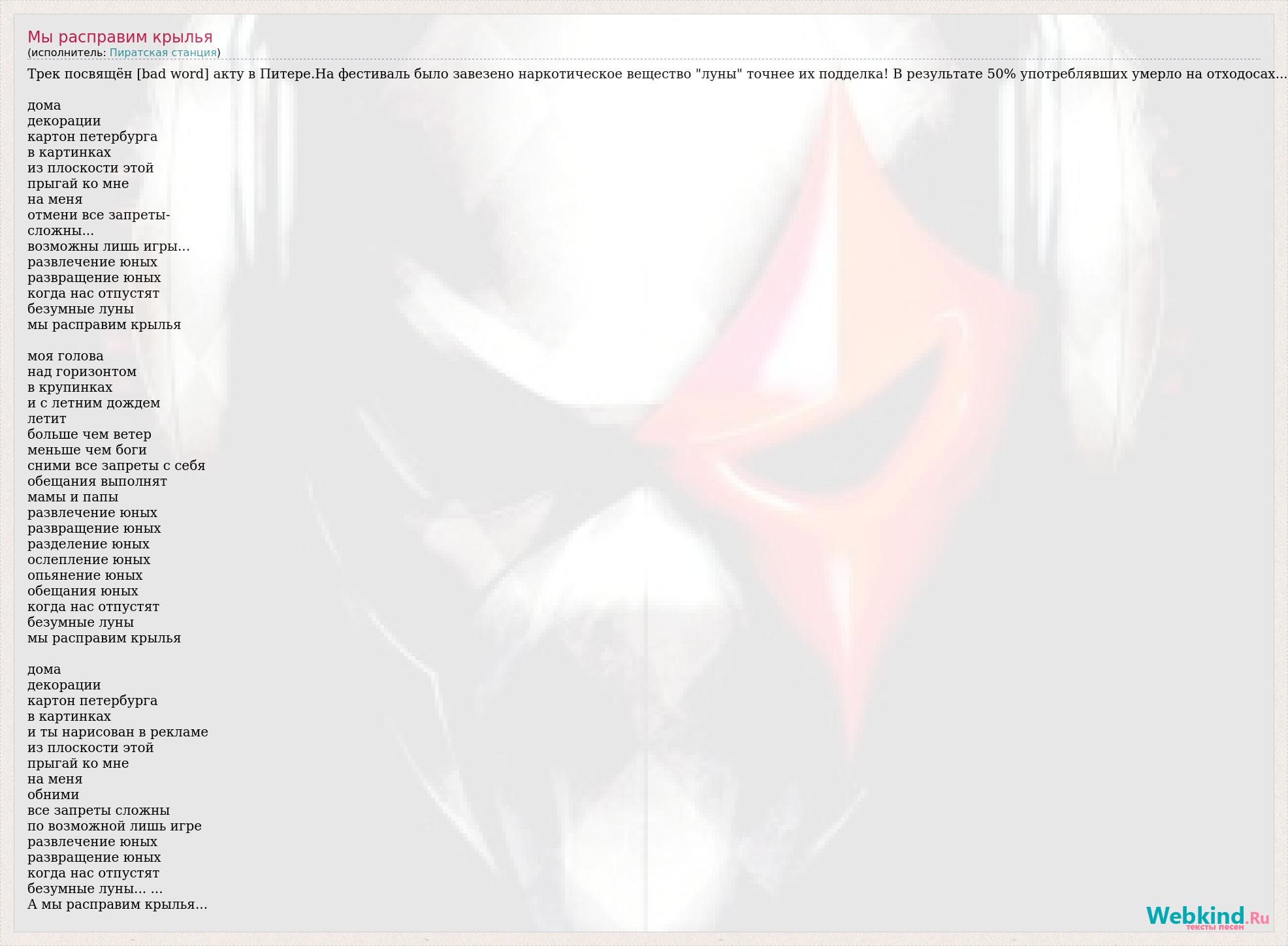 Трек посвящён [bad word] акту в Питере.На фестиваль было завезено наркотическое вещество "луны" точнее их подделка! В результате 50% употреблявших умерло на отходосах... дома декорации картон петербурга в картинках из плоскости этой прыгай ко мне на меня отмени все запреты- сложны... возможны лишь игры... развлечение юных развращение юных когда нас отпустят безумные луны мы расправим крылья моя голова над горизонтом в крупинках и с летним дождем летит больше чем ветер меньше чем боги сними все запреты с себя обещания выполнят мамы и папы развлечение юных развращение юных разделение юных ослепление юных опьянение юных обещания юных когда нас отпустят безумные луны мы расправим крылья дома декорации картон петербурга в картинках и ты нарисован в рекламе из плоскости этой прыгай ко мне на меня обними все запреты сложны по возможной лишь игре развлечение юных развращение юных когда нас отпустят безумные луны... ... А мы расправим крылья...